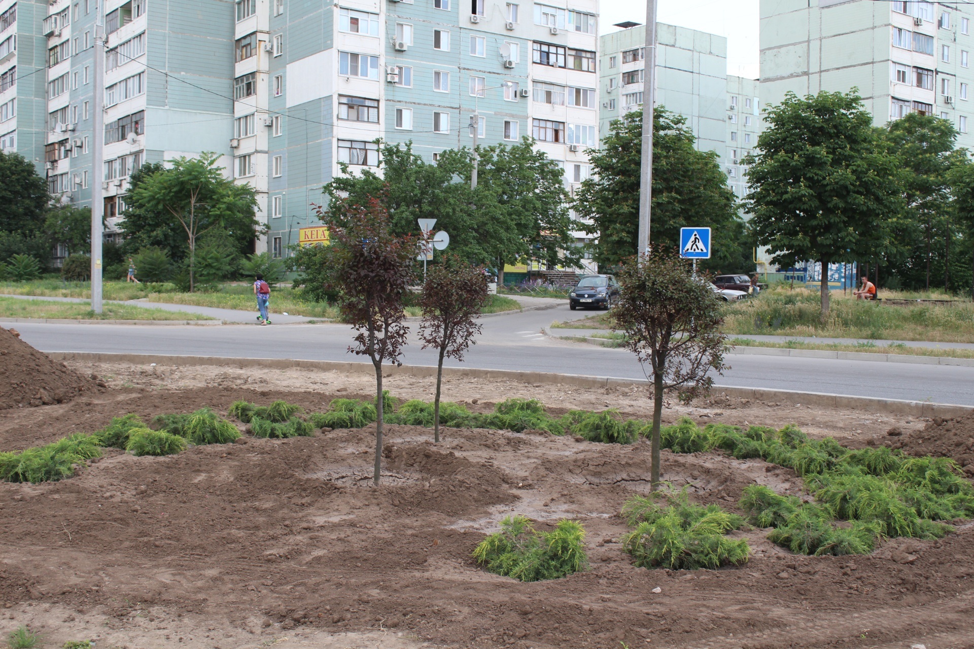 Круговий автомобільний переїзд на цій ділянці знаходився у занедбаному стані. Тому працівники КП «Зеленбуду» облаштували територію. На клумбі з’являться нові рослини, дерева, працівники підприємства підготовлюють ґрунту для гідропосіву. Роботи планують закінчити через тиждень.