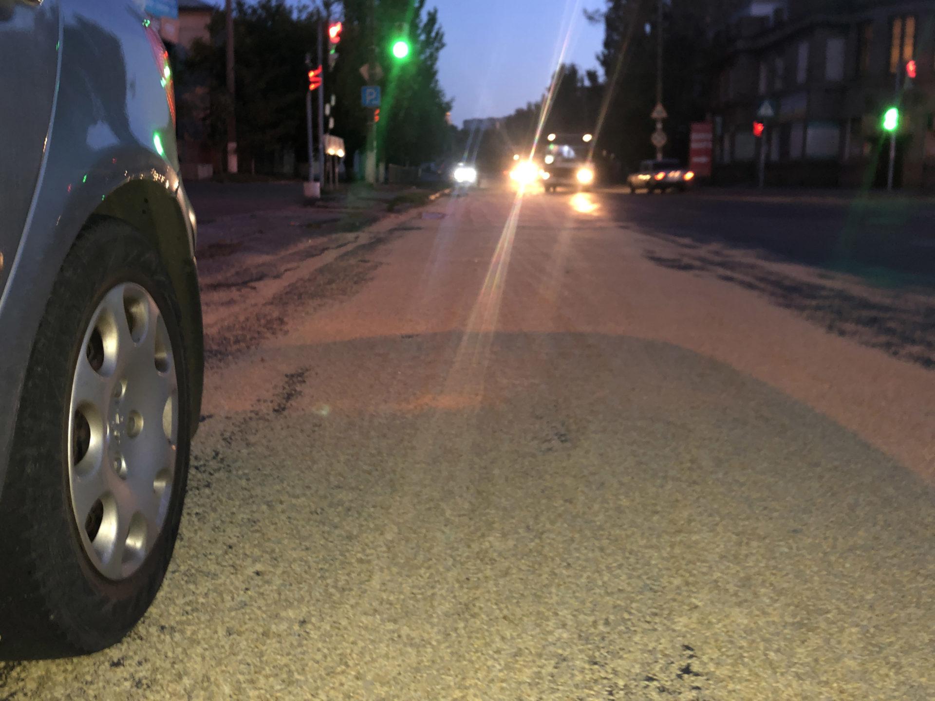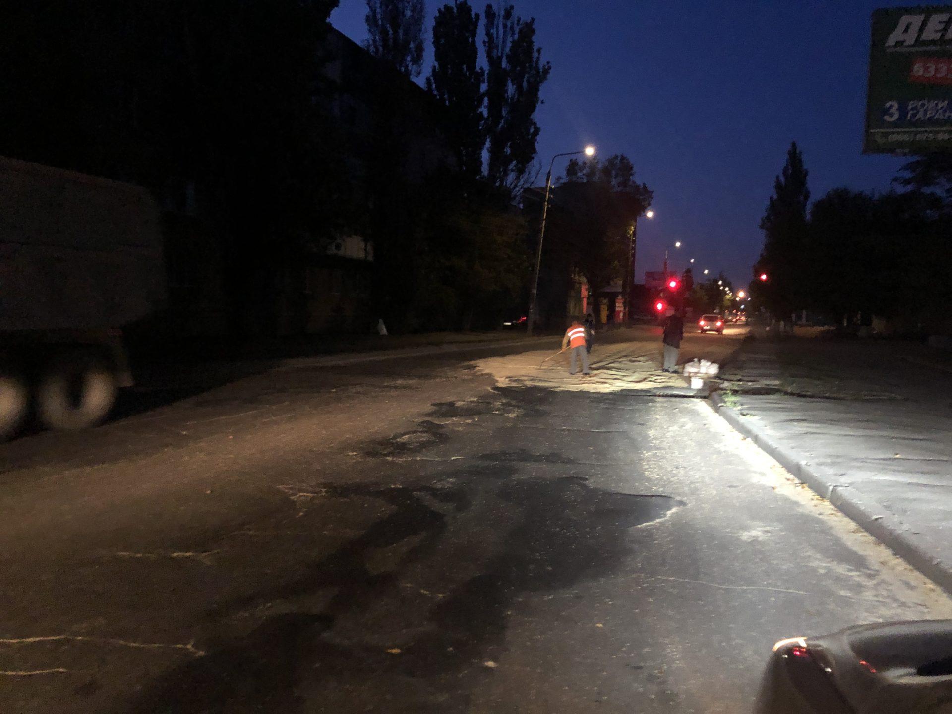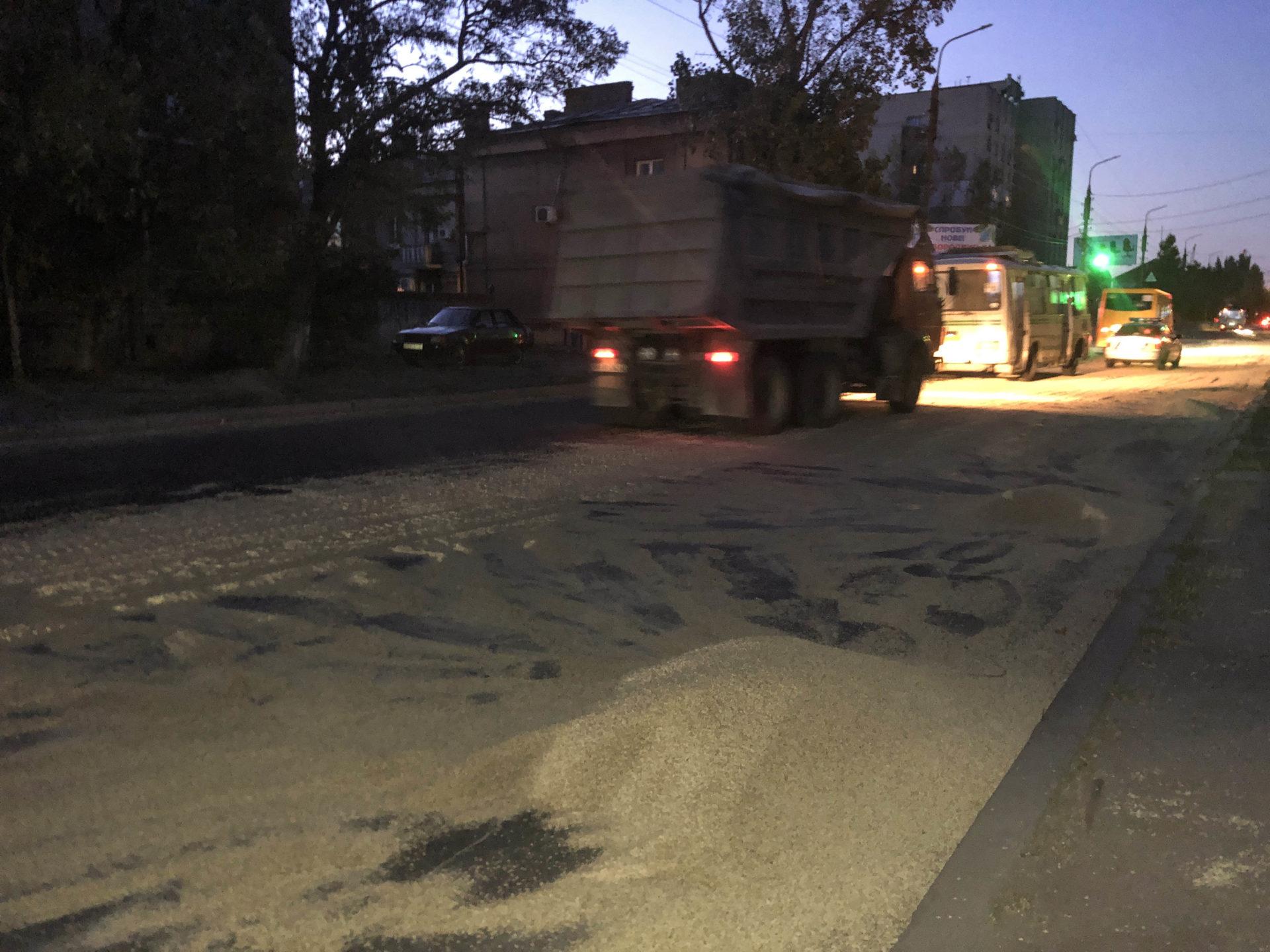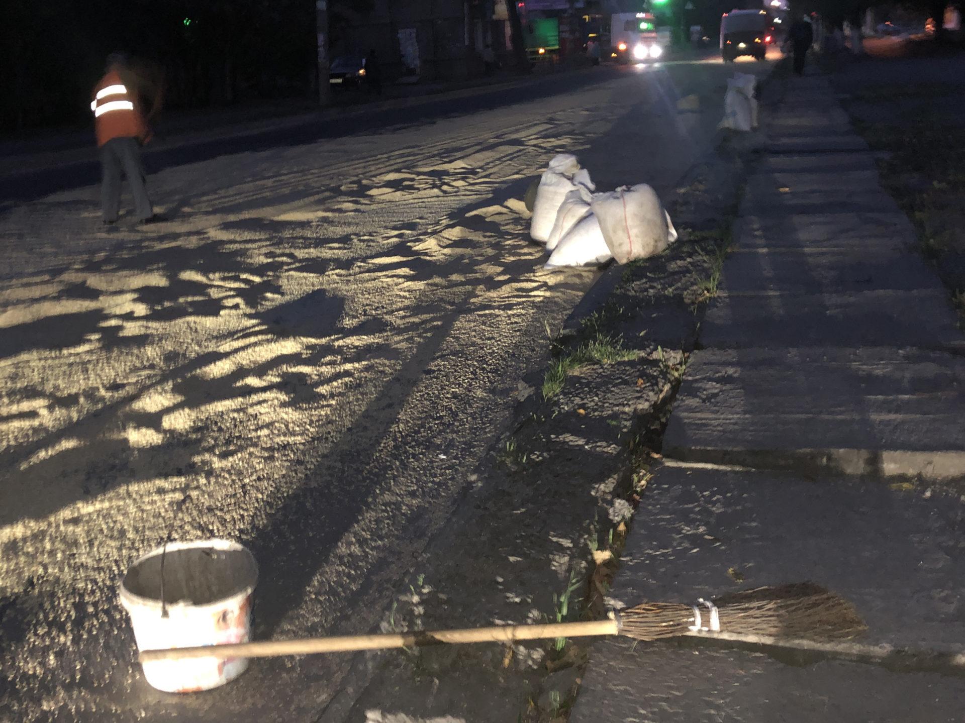 На Західному проспекті, в районі автозаку, у невстановленого автомобіля висипалося зерно на дорогу. Комунальники згрібали його мішками.