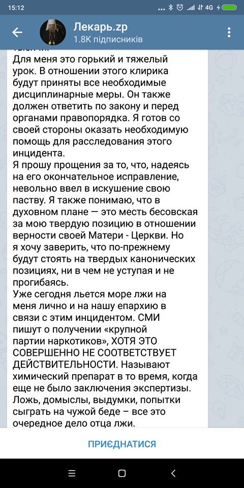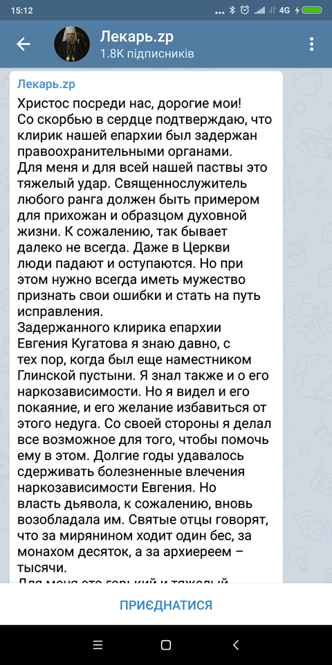 На своїй сторінці в телеграм він сповістив підписників, що знав про наркозалежність підлеглого, проте сподівався, що чоловіку вдалося позбавитися від наркотиків назавжди. Пообіцяв прийняти всі необхідні міри у відношенні до затриманого клірика та всіляко допомагати в розслідуванні.