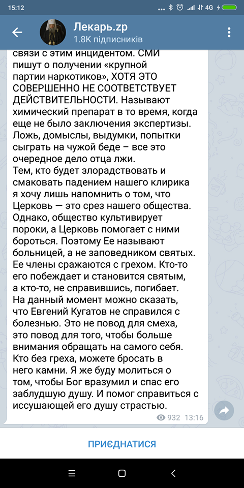Вчора, 29 листопада, ми повідомляли про затримання правоохоронцями священнослужителя Російської церкви – ієромонаха Свято-Андріївського кафедрального собору, що знаходиться у місті Запоріжжя, Євгенія Кугатова. На «Новій пошті» він отримав посилку з наркотиками з Черкас.