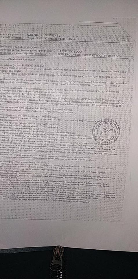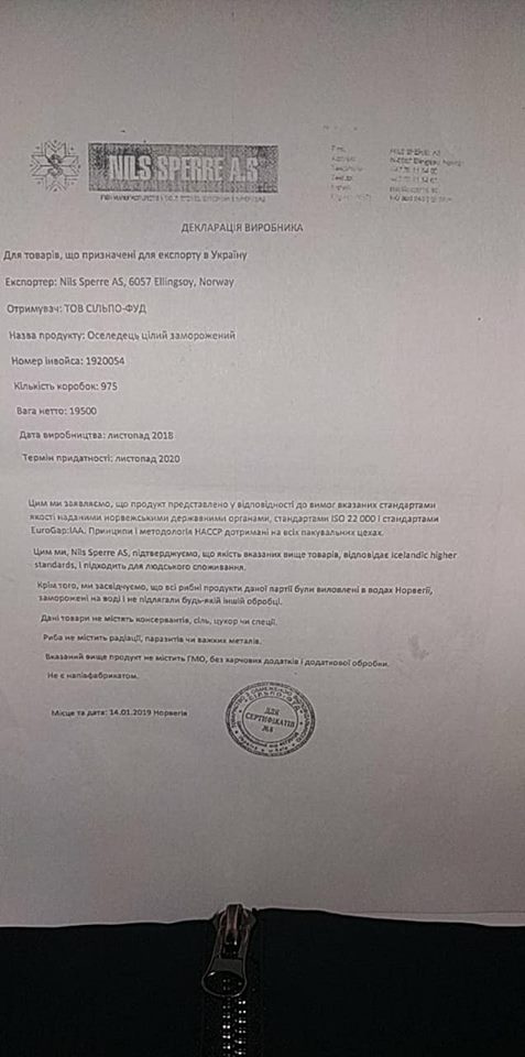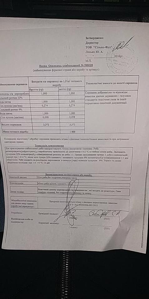 Документи є лише на свіжоморожену рибу, а також на технологію виробництва посолу, який співробітники роблять самі. Результатів експертизи, про те ще цей продукт не має бактерій і його можна вживати немає.