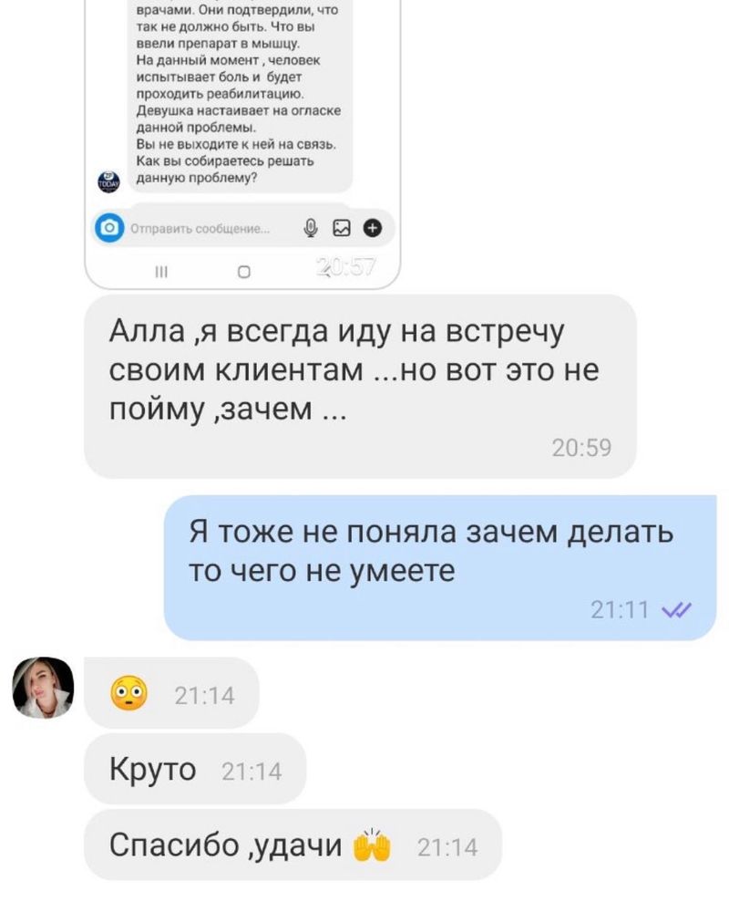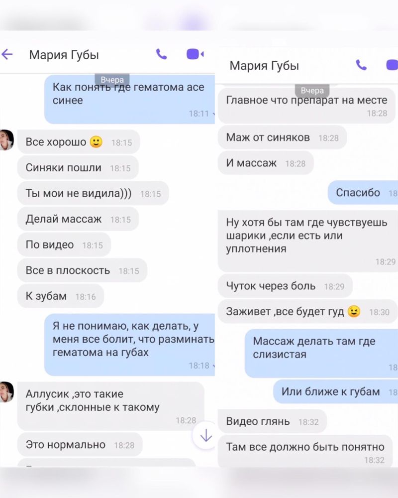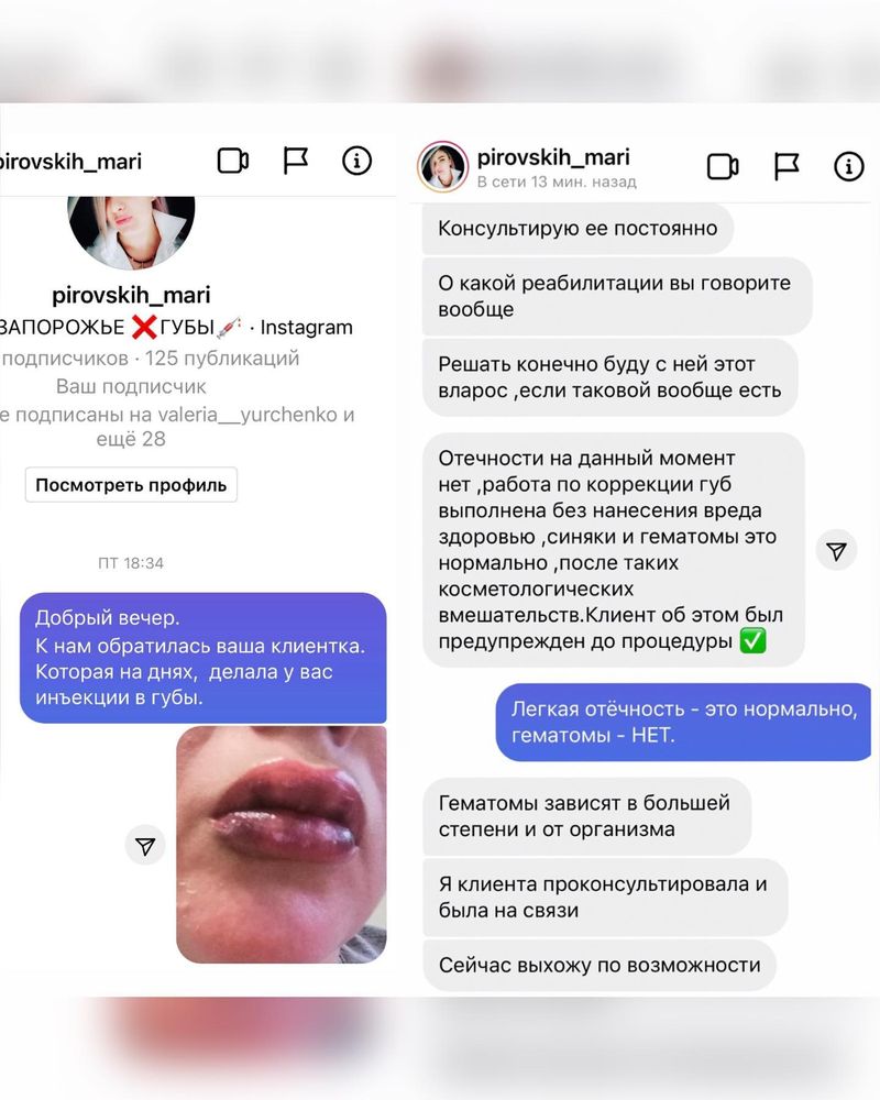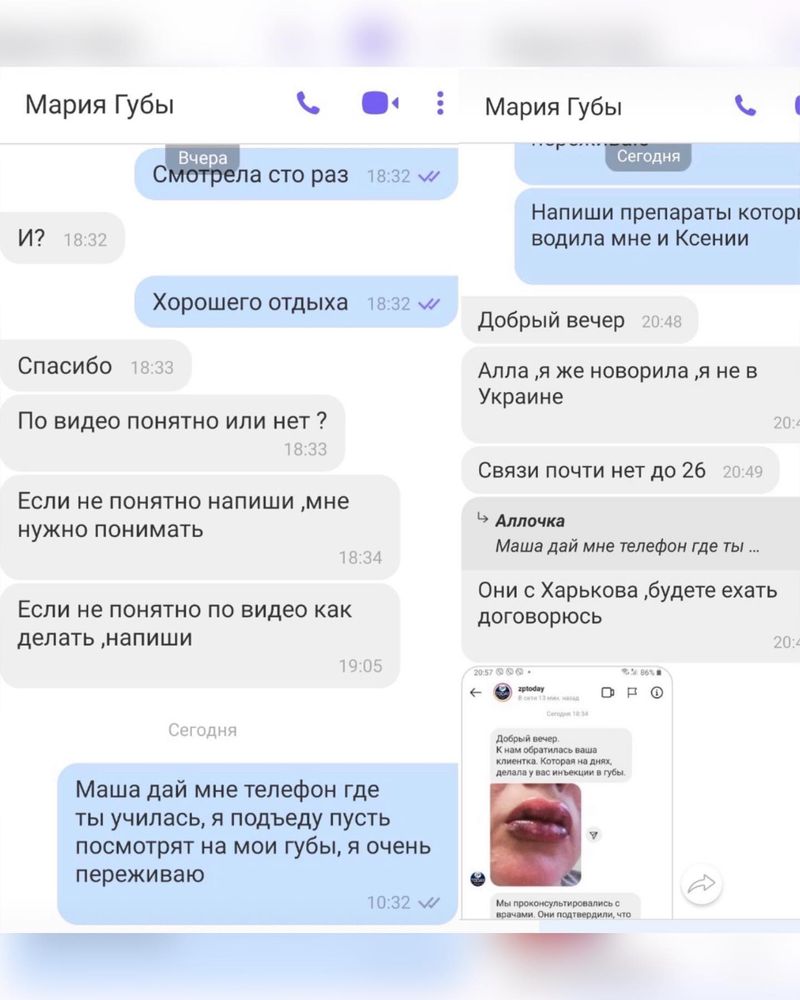 Адміністратори пабліка звернулись до майстрині, яка понівечила губи клієнтці, і вже ввечері вона вийшла на зв’язок. Марія запевнила, що синці і гематоми – це нормально і все було виконано без шкоди здоров’ю. Втім, медик, до якого за допомогою прибігла налякана клієнтка, повідомив, що майстриня зробила ін’єкцію у м’яз і ні в якому разі не можна масажувати губи. Аллі прописали ліки та відправили додому.