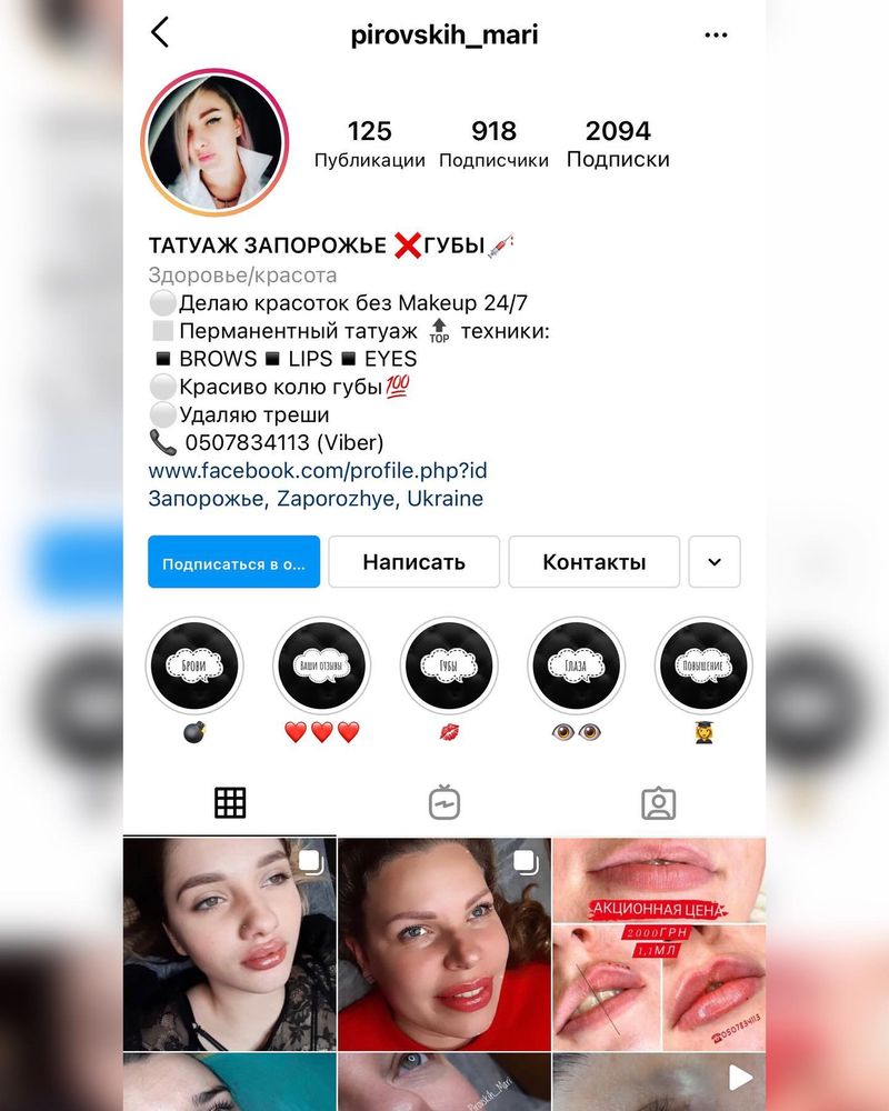 Варто зазначити, що у профілі майстра вказано, що вона займається перманентним макіяжом та робить ін’єкції в губи, щодо сертифікатів — в аккаунті ми не знайшли жодного. Більше того, на сторінці є допис від 21.02 про знижку на ін’єкцію преміум-класу, яка коштує 2000 гривень.