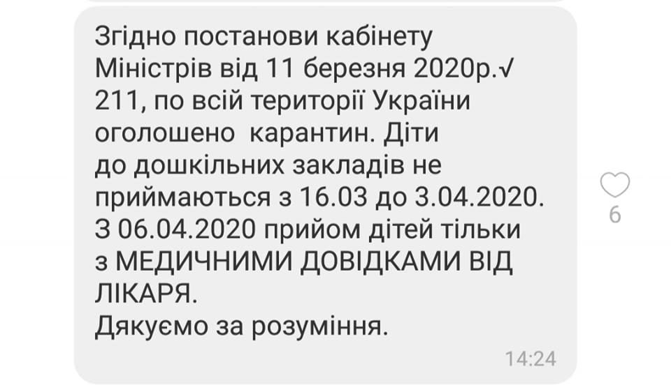 У батьківські групи почали приходити повідомлення, що дошкільні заклади закривають на карантин з 16:03 до 3:04. Тож тепер дорослим треба думати куди прилаштувати свою малечу на цей період.