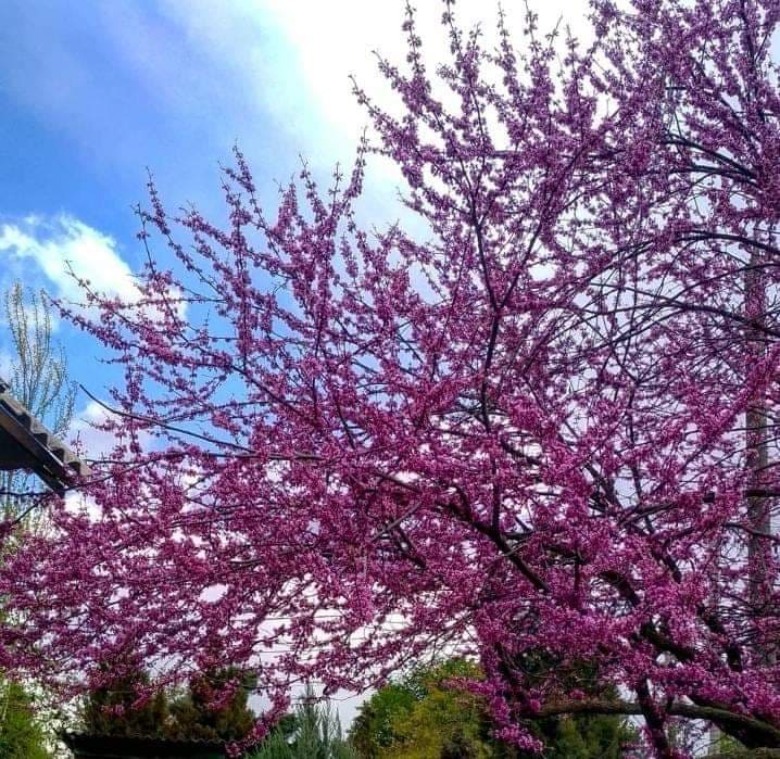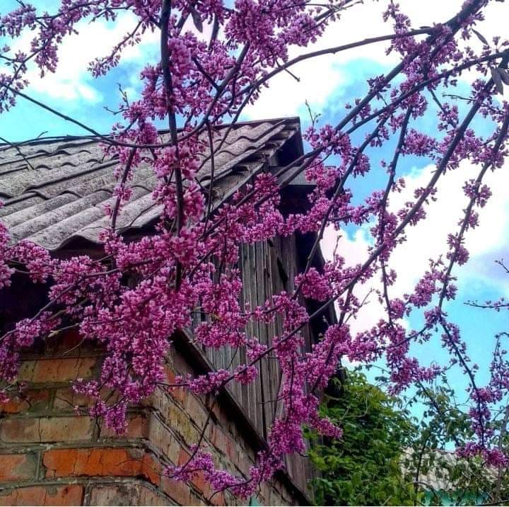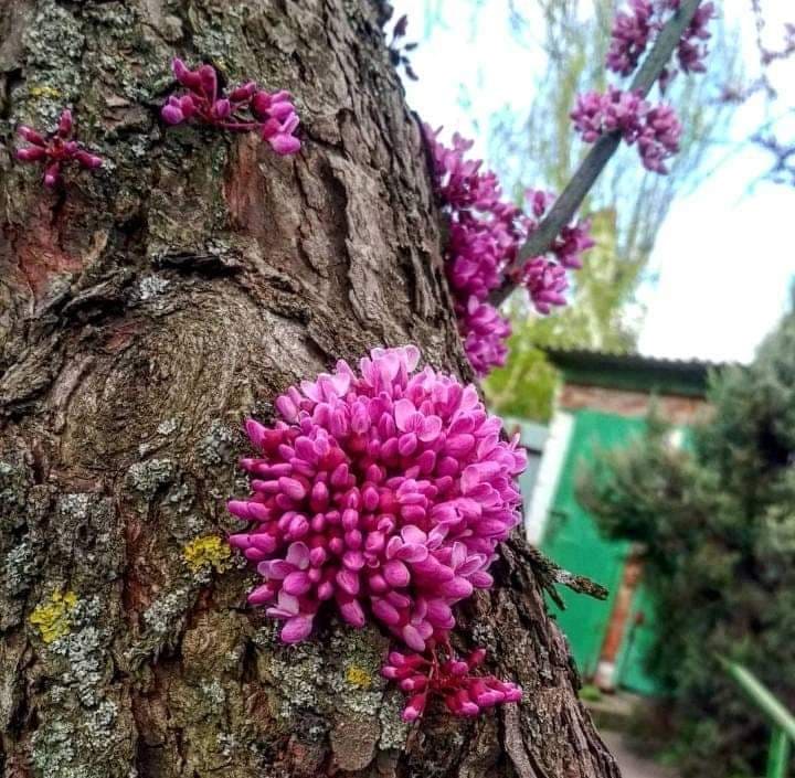 В саду почав квітнути Церсис канадський – один з найяскравіших представників сімейства бобових. Особливе воно тим, що квіти на ньому з’являються не тільки на гілках, а й сплячих бруньках на поверхні стовбура. Казкове видовище.