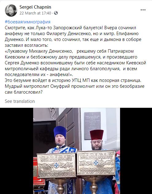 «Лукавому Михайлу Денисенку, який нарік себе Патріархом Київським і безбожною справою зайнявся, і сотворив Сергія Думенка, котрий вважає себе спадкоємцем Київської митрополичої кафедри заради особистого добробуту, і всім послідовникам — анафема!» — зачитує церковник на відео.