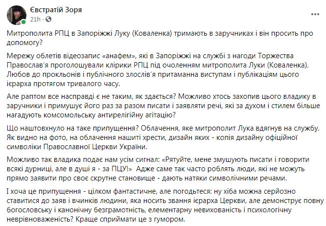 Заступник голови управління зовнішніх церковних зв’язків Православної церкви України Євстратій Зоря відповів на ці дії РПЦ. Зоря жартівливо припустив, що «Луку тримають в заручниках».