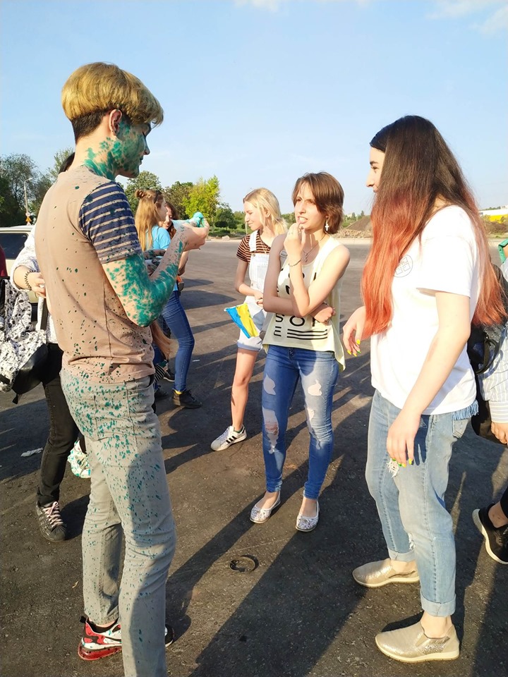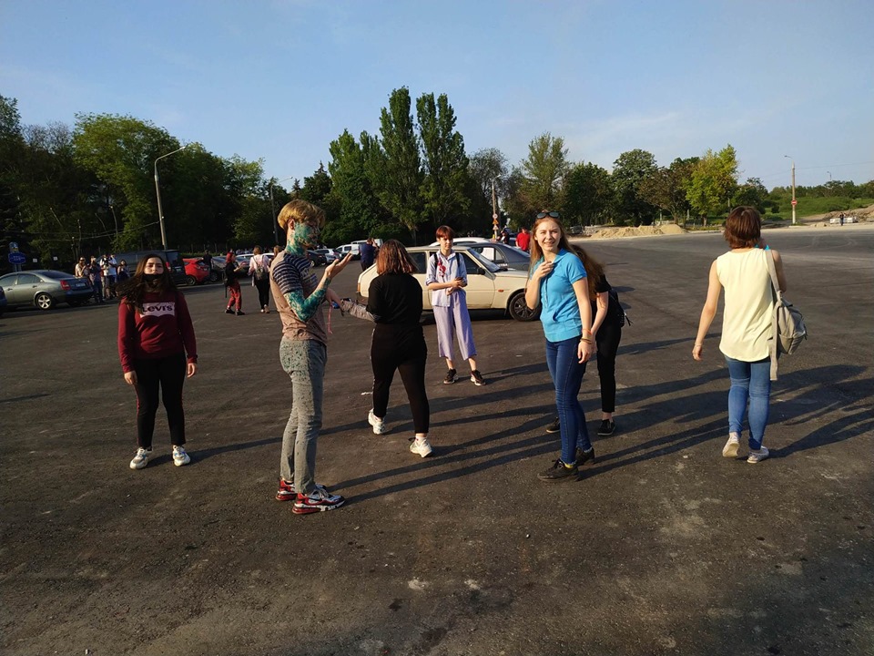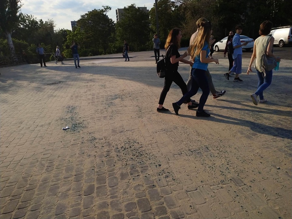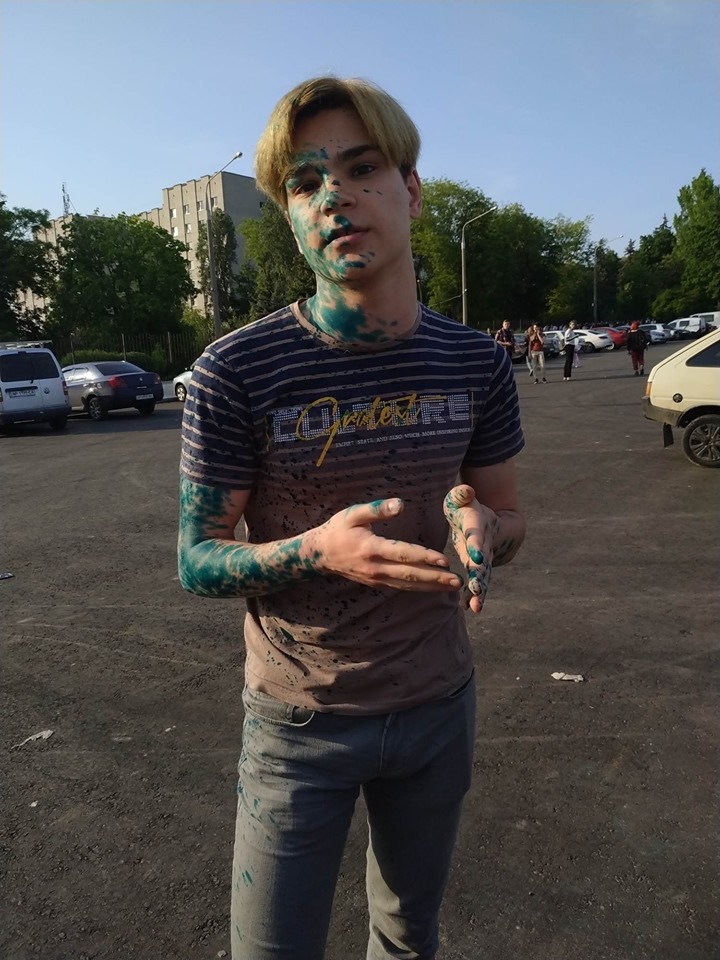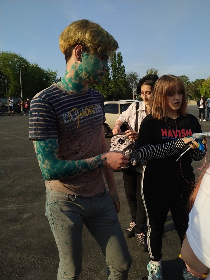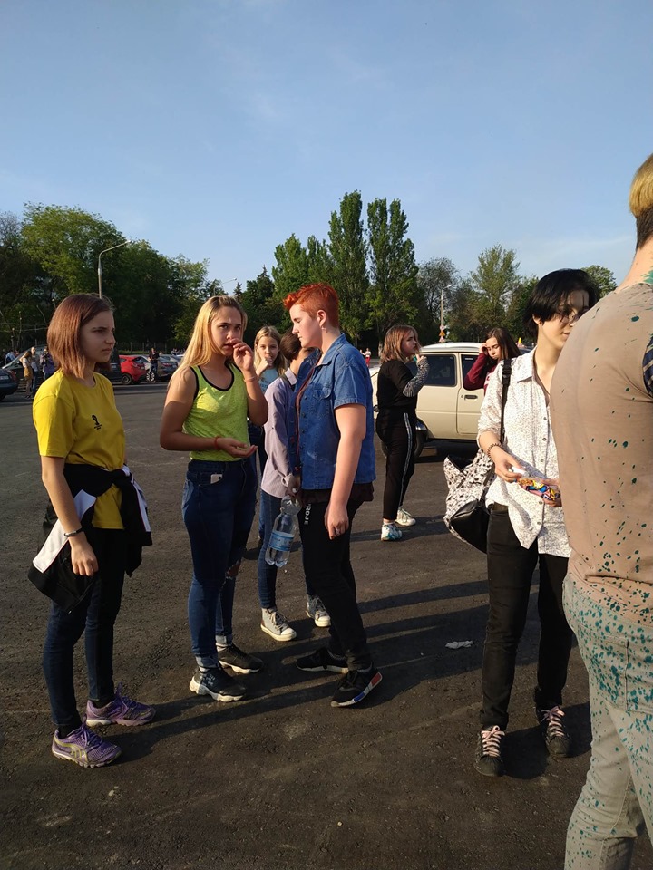 Схоже, не лише люди у масках не знали,що захід перенесли. Зненацька до групи підлітків підійшли інші неповнолітні і облили їх зеленкою. Припускаємо, що це інша група противників подібного руху, яка просто не ідентифікувала осіб, подумавши, що це учасники акції. Підлітки облили і втекли, інші розгублено радилися як відмити зеленку з одягу.