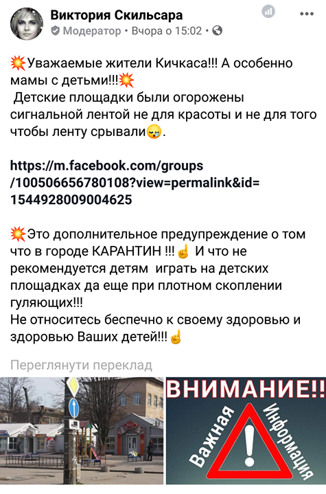 Дописувачі у групі «Новий Кічкас» поскаржилися, що не всі батьки дотримуються правил, водять на майданчики малечу. Іноді навіть зривають стрічки.