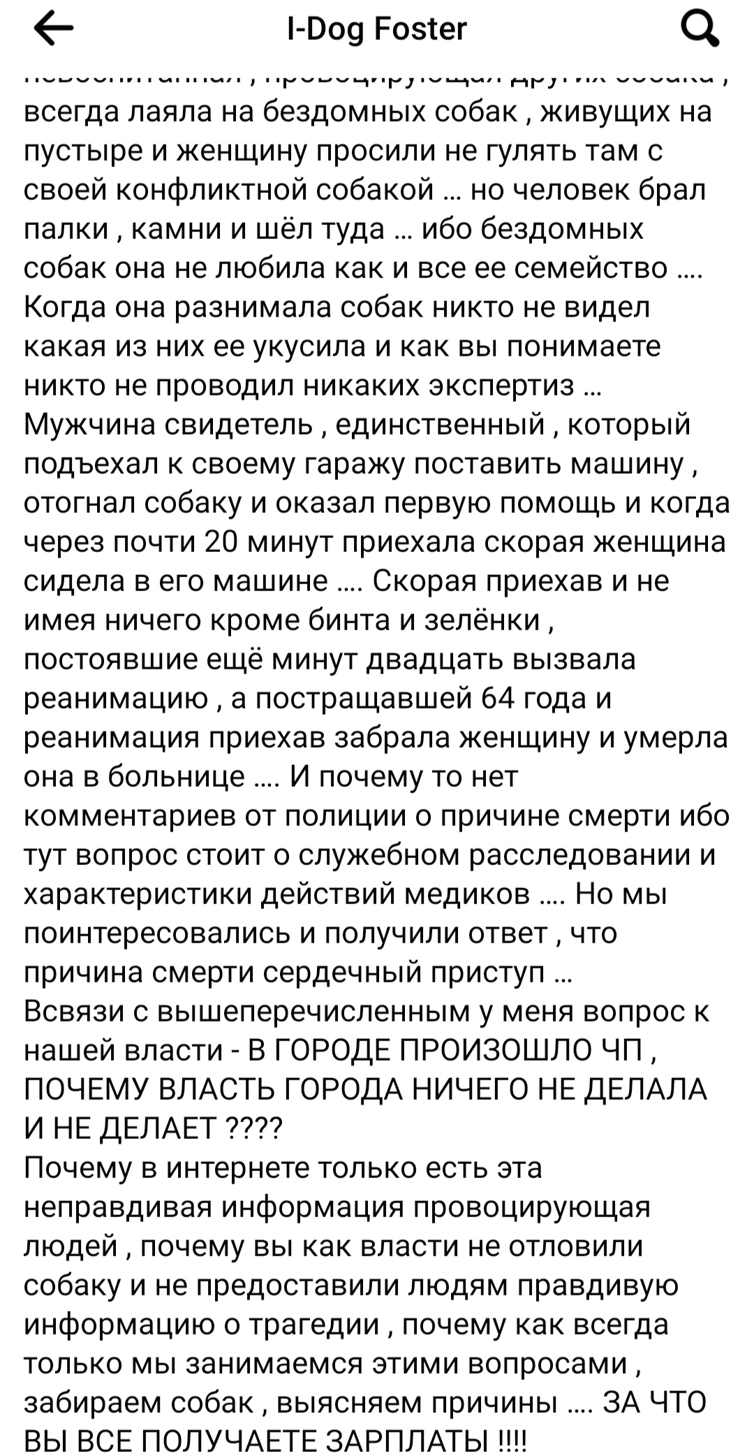 Втім, працівники клініки I-dog Foster розповіли іншу історію розвитку події. Так, вони забрали під опіку пса, який покусав жінку. За словами працівників, постраждала пішла з життя через серцевий напад, а не через укус. Та й взагалі собака напав не на жінку, а на її пса. Також зазначається, що спочатку на місце події викликали швидку, яка нічого не зробила, бо мала при собі лише бинт. Потім на місце приїхала реанімаційна бригада та ушпиталила постраждалу. Померла вона в лікарні.