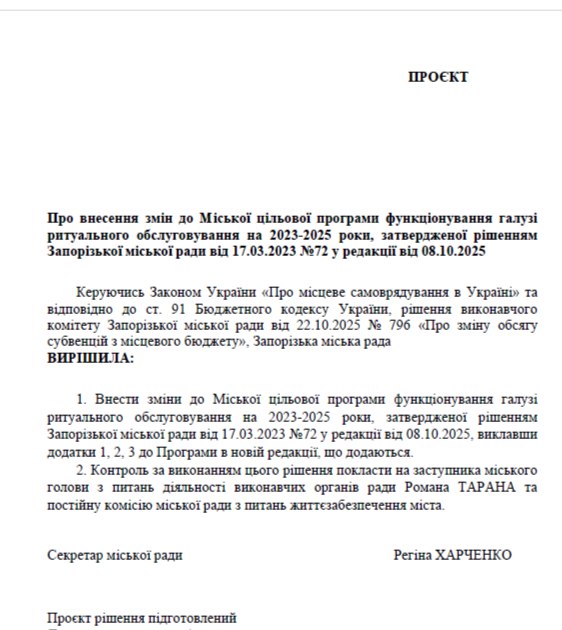 Запорізька міська рада планує внесення змін до Міської цільової програми функціонування галузі ритуального обслуговування на 2023–2025 роки.