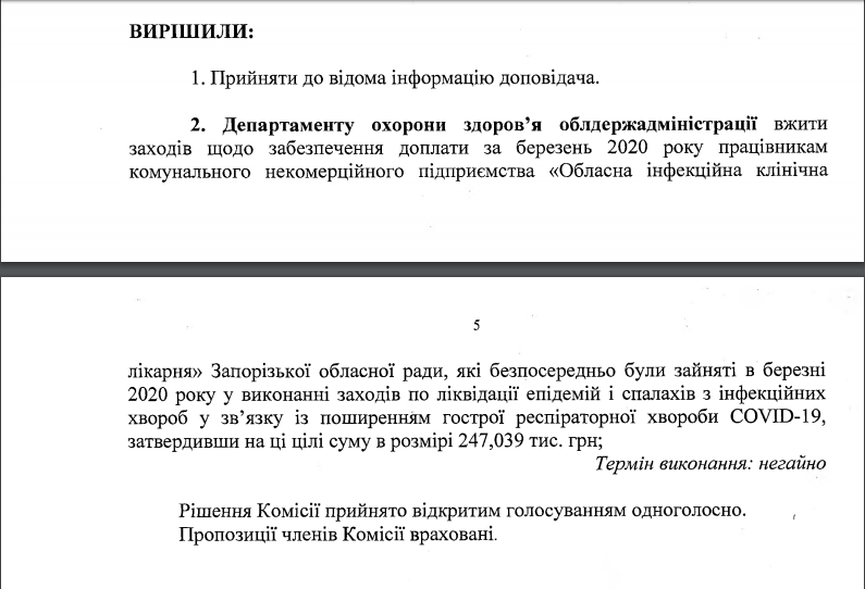 Згідно із рішення регіональної комісії з питань техногенно-екологічної безпеки та надзвичайних ситуацій в Запорізькій області, працівникам «Обласна інфекційної клінічної лікарні», які брали участь у боротьбі зі спалахами та поширенням коронавірусу COVID-19, доплатять гроші за березень.