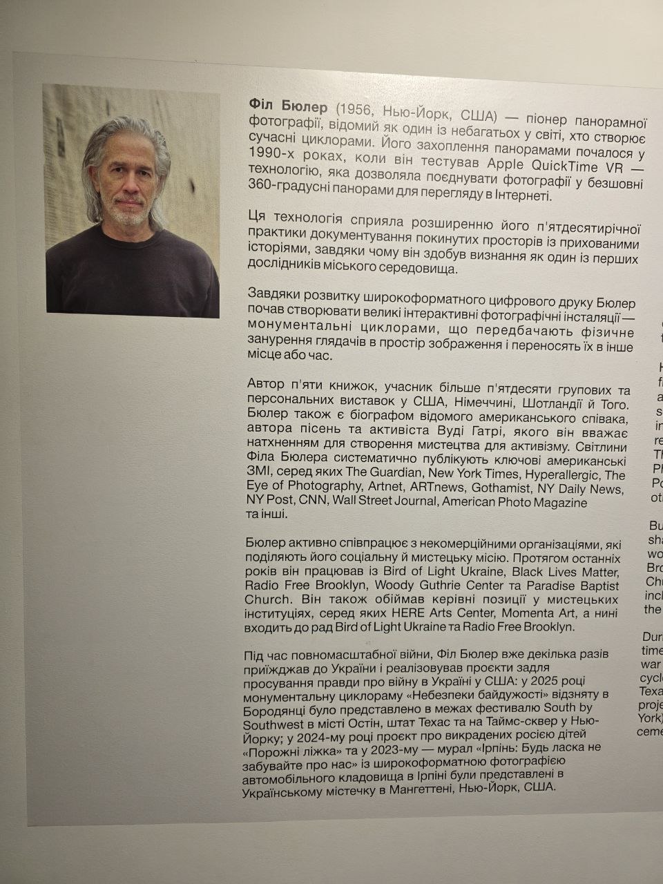 Крім циклорами, на виставці представлені портрети шістдесяти американців, які активно допомагають Україні, а також документальний фільм, у якому інтелектуали США щиро діляться своїми думками про повномасштабну російську агресію. Усе це — частина великого міжнародного дослідницького проєкту за участі симпозіуму BIRUCHIY contemporary art project, громадських організацій та департаменту культури Запорізької міської ради.