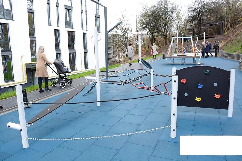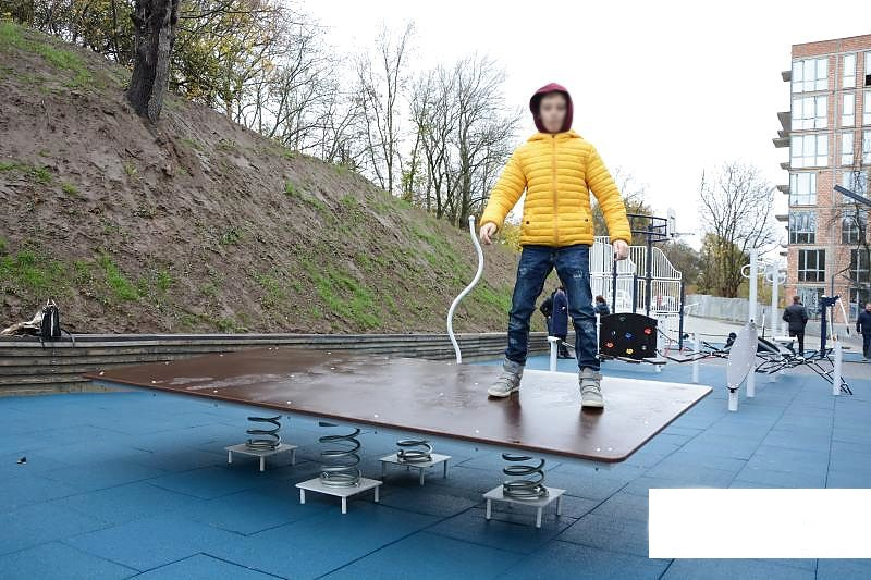 - Сучасний дитячо-спортивний майданчик із лазалками, балансирами, пісочницями та іншими ігровими елементи, антитравматичним покриттям, неагресивною фоновою архітектурою, з пластичними формами та ландшафтними елементами.