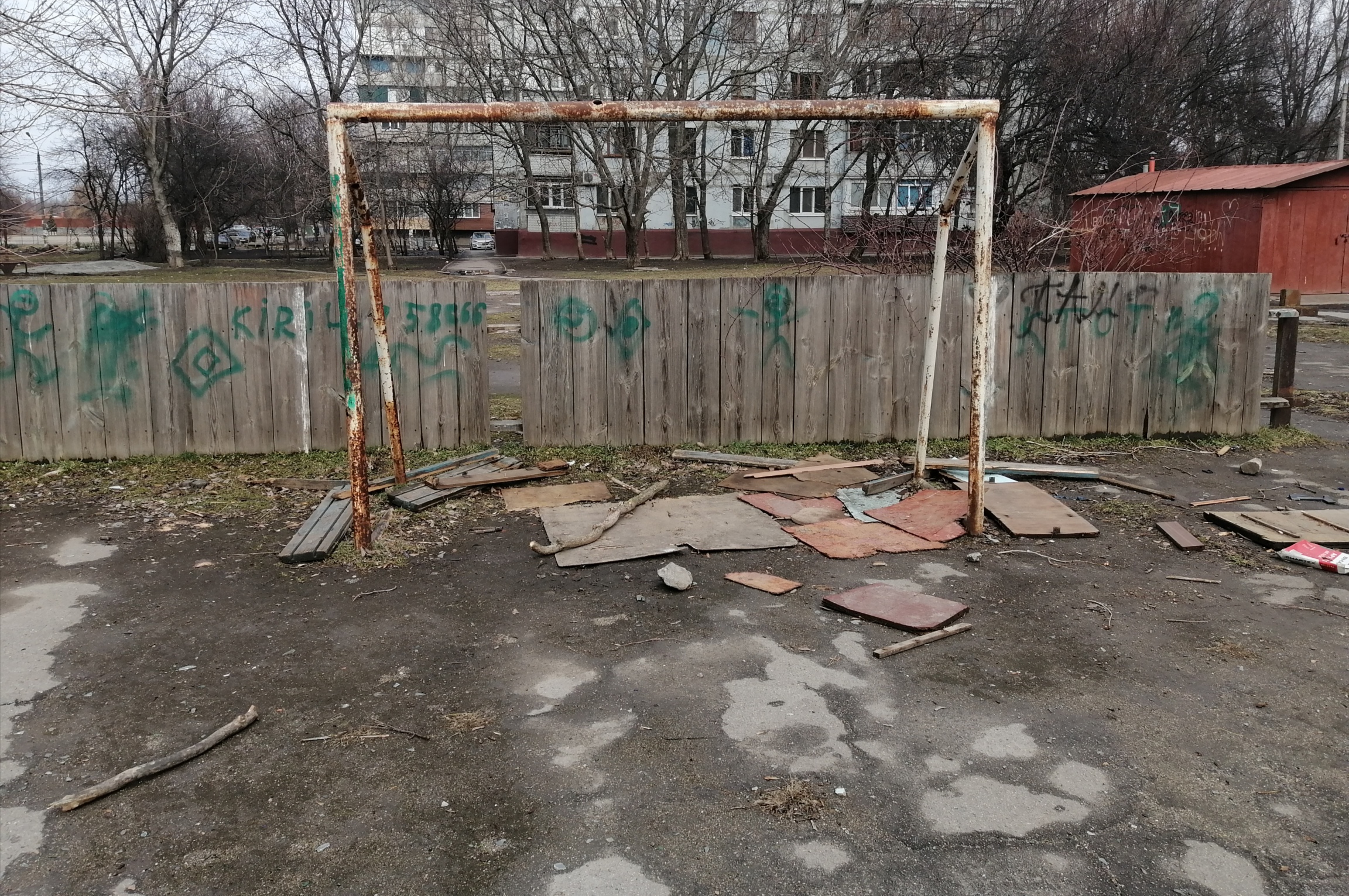 Футбольне поле розміщено на асфальті, покриття нерівне, ворота покрились іржавою, а фарба давно зійшла. Огорожа – розламана, а територія занедбана – саме такий вигляд має майданчик з огляду на світлини. Ініціатор Сергій Скрипка просить встановити турніки, тренажери та столи для настільного тенісу і облагородити територію.
