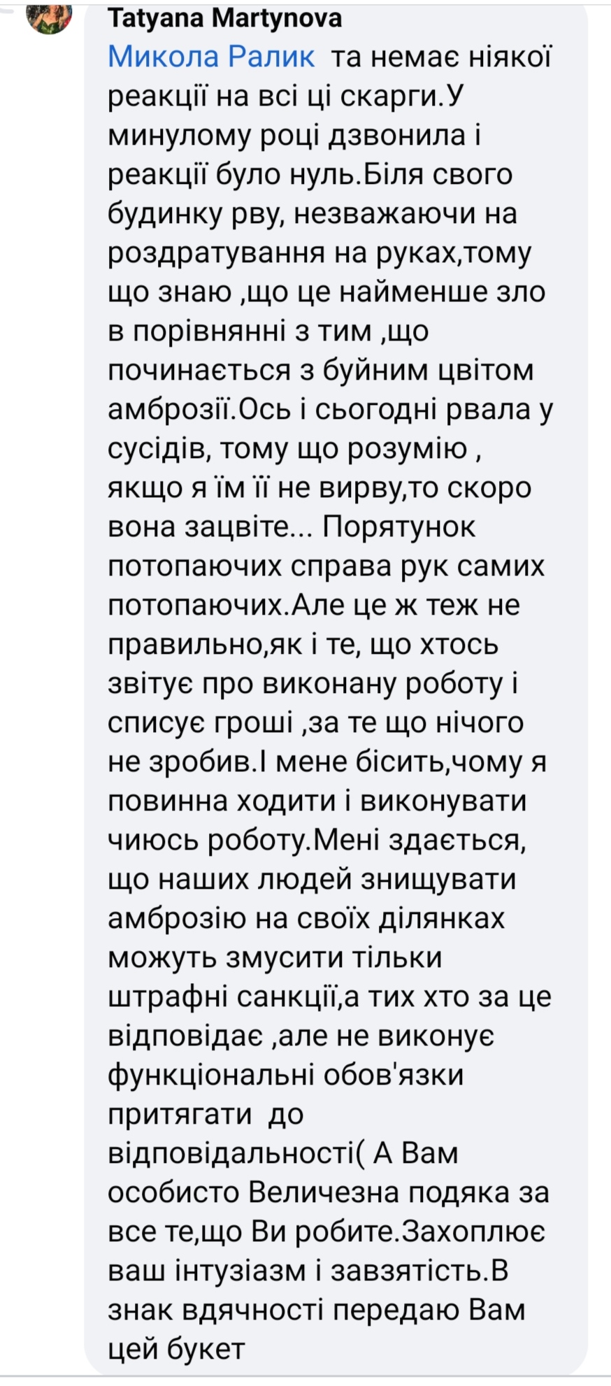 Так, в Комунарському районі Запоріжжя, по вулиці Комарова,13 місцеві мешканці обурюються, що на території розрослася амброзія, яку щорічно доводиться знищувати людям. Все б нічого, але ті, хто страждає на алергію, попри роздратування шкіри, знищують горе-рослину. Тому, люди просять місцеву владу зробити хоч щось аби полегшити життя запоріжцям.