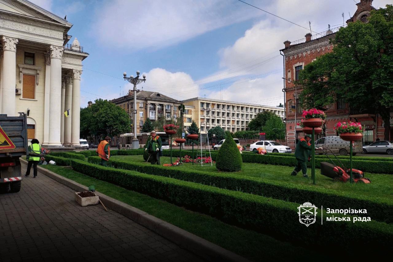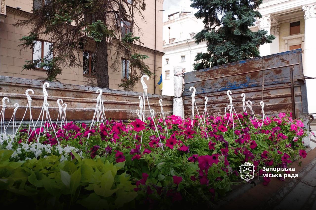 Сурфінії, дихондри та іпомеї сьогодні прикрасили клумбу біля музично-драматичного театру ім. В. Г. Магара у Запоріжжі.