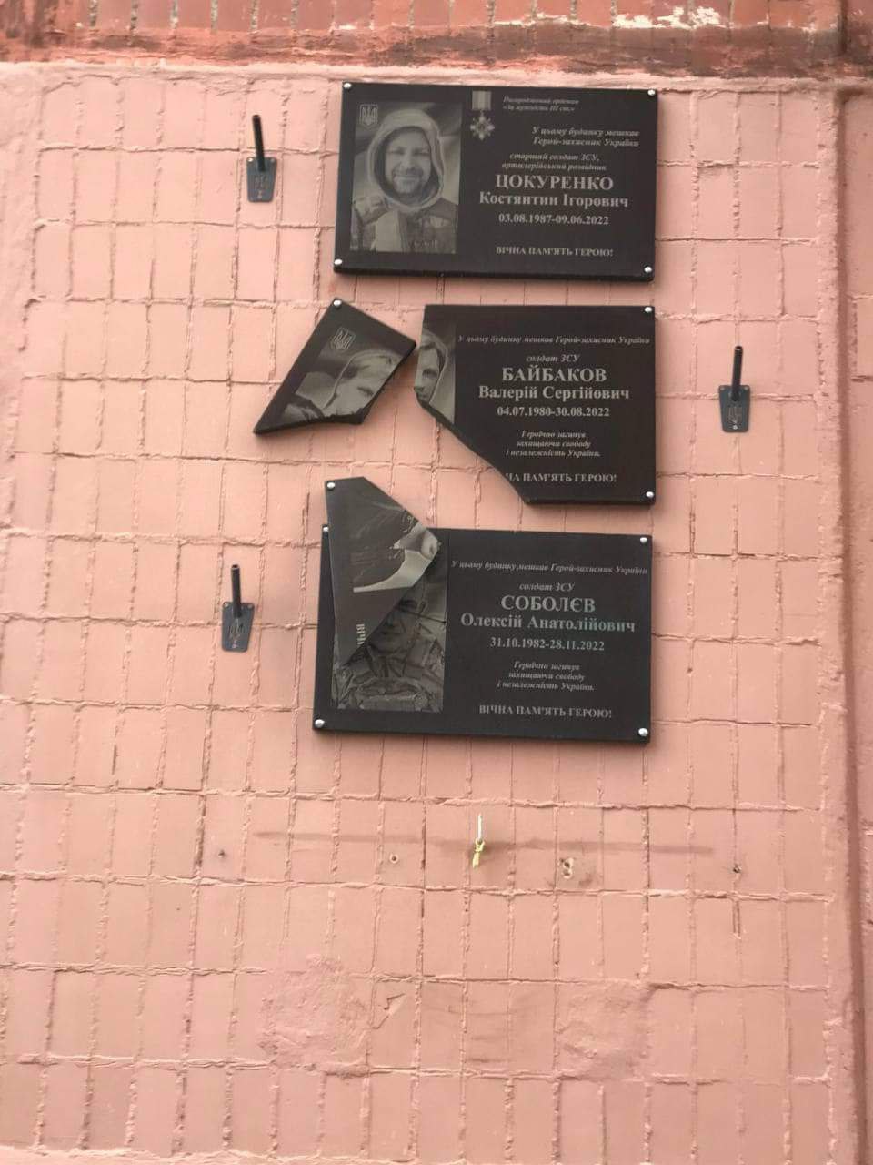 В обласному центрі невідомі вандали пошкодили три меморіальні дошки, встановлені у Південному мікрорайоні міста, які вшановують пам’ять про українських захисників, що віддали своє життя за Україну.