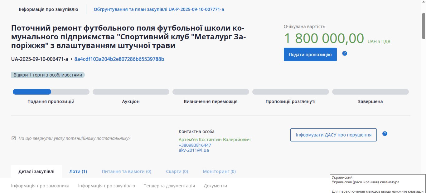 Очікувана вартість 1 800 тис. грн. Згідно з технічним завданням, роботи виконуватимуться на полі за адресою: вул. Героїв Крут, 2. Проєкт передбачає повний демонтаж старого покриття та улаштування нової основи.