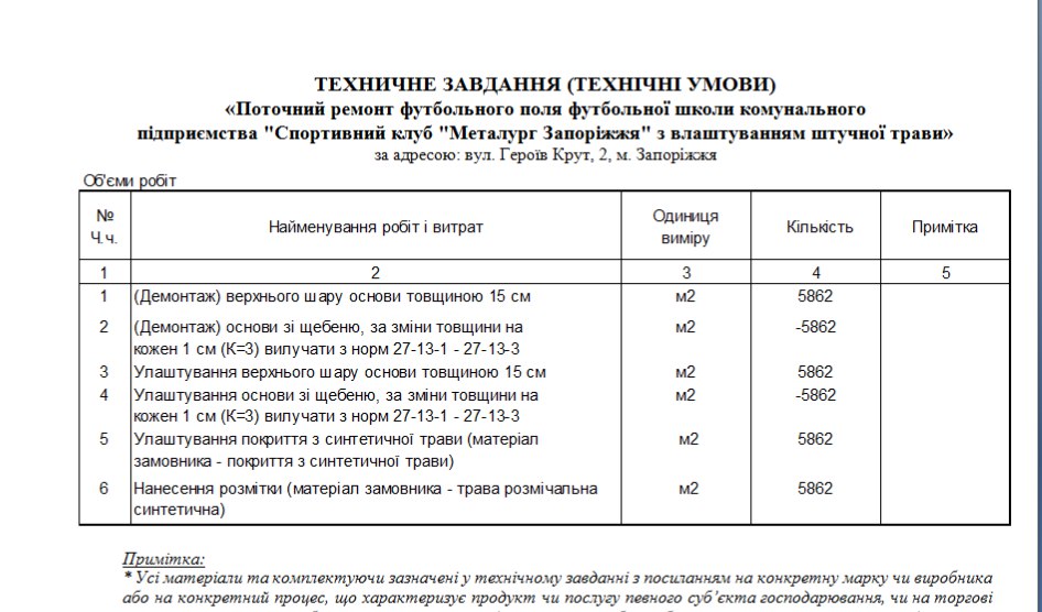 У Запоріжжі планують провести поточний ремонт футбольного поля дитячо-юнацької школи комунального підприємства «Спортивний клуб “Металург Запоріжжя”.