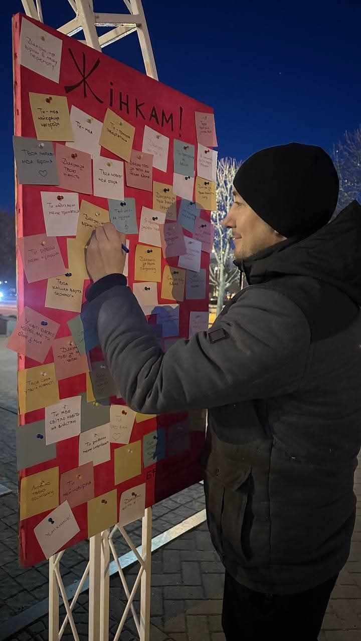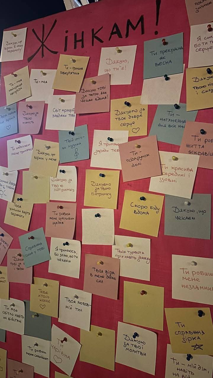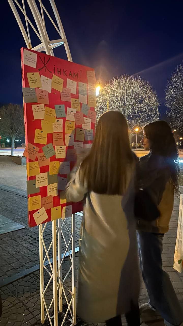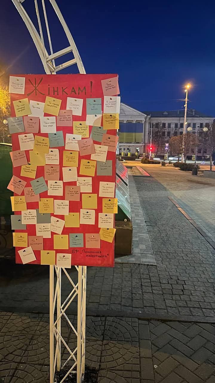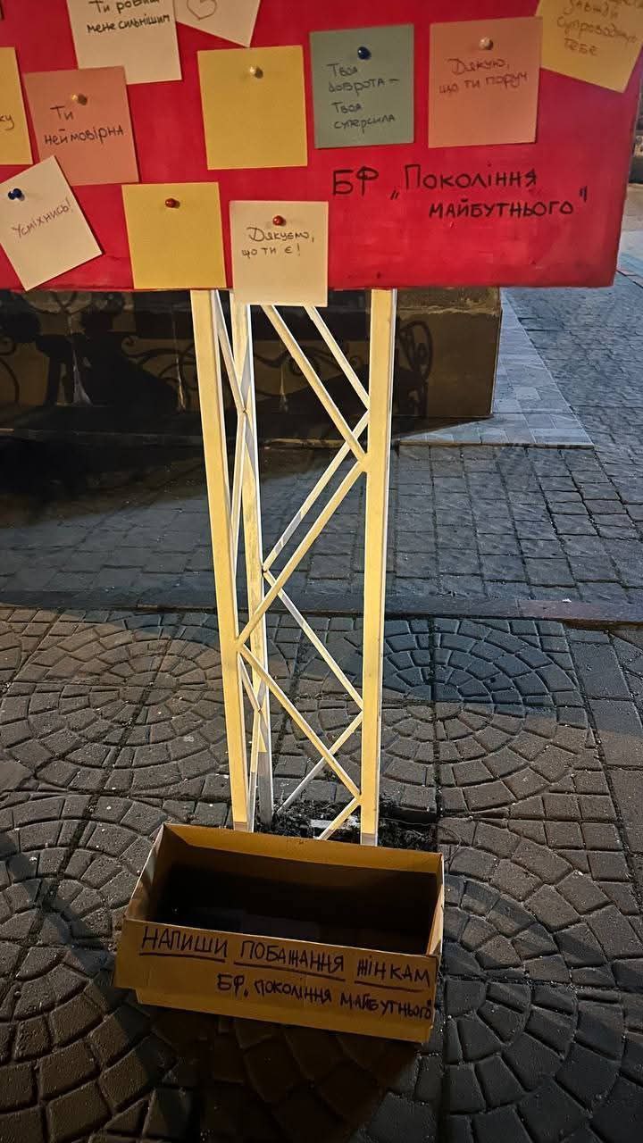 Окрім готових повідомлень, фонд залишив порожні стікери та маркери, дозволяючи всім охочим написати власні побажання жінкам і прикріпити їх до інсталяції.