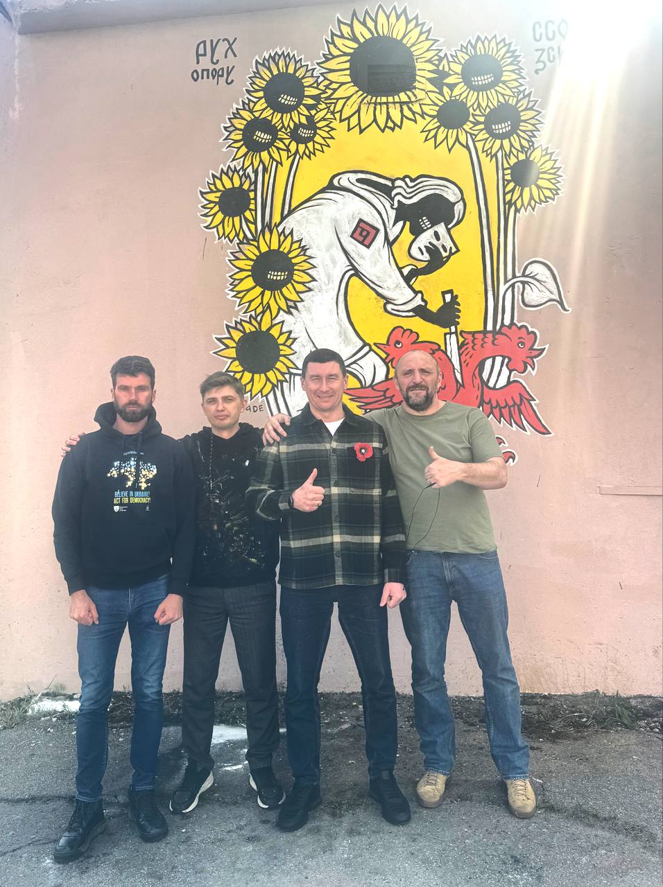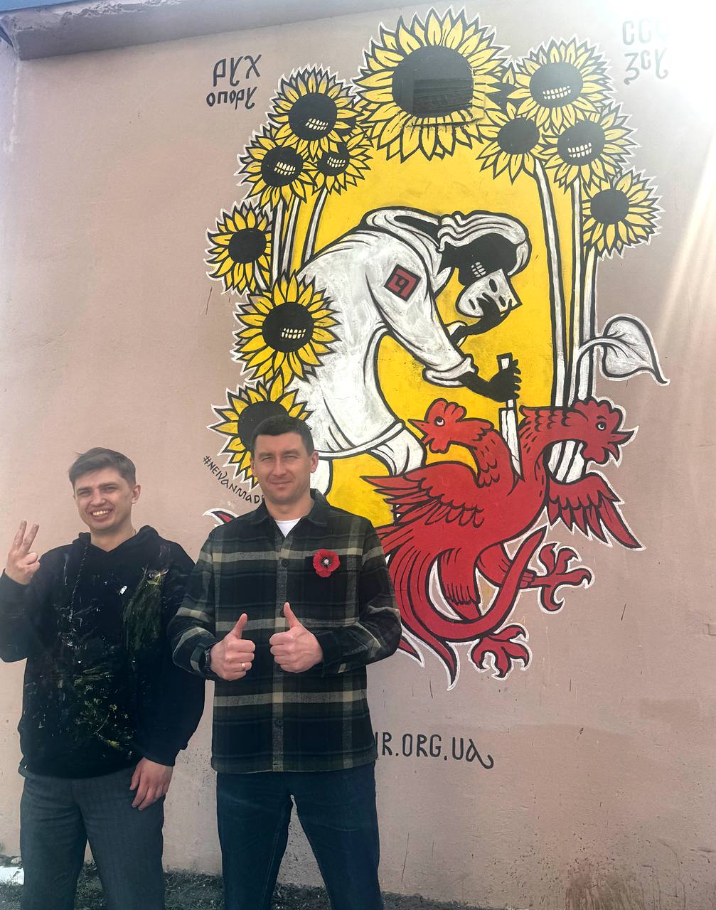 Новий мурал — частина серії “Стінописи Опору”, що передає незламний дух українців. На ньому — тінь у масці з ножем, яка завдає удару червоному двоголовому півню — гротескному символу російських імперських амбіцій.