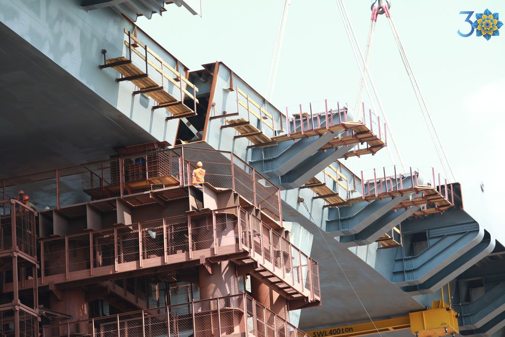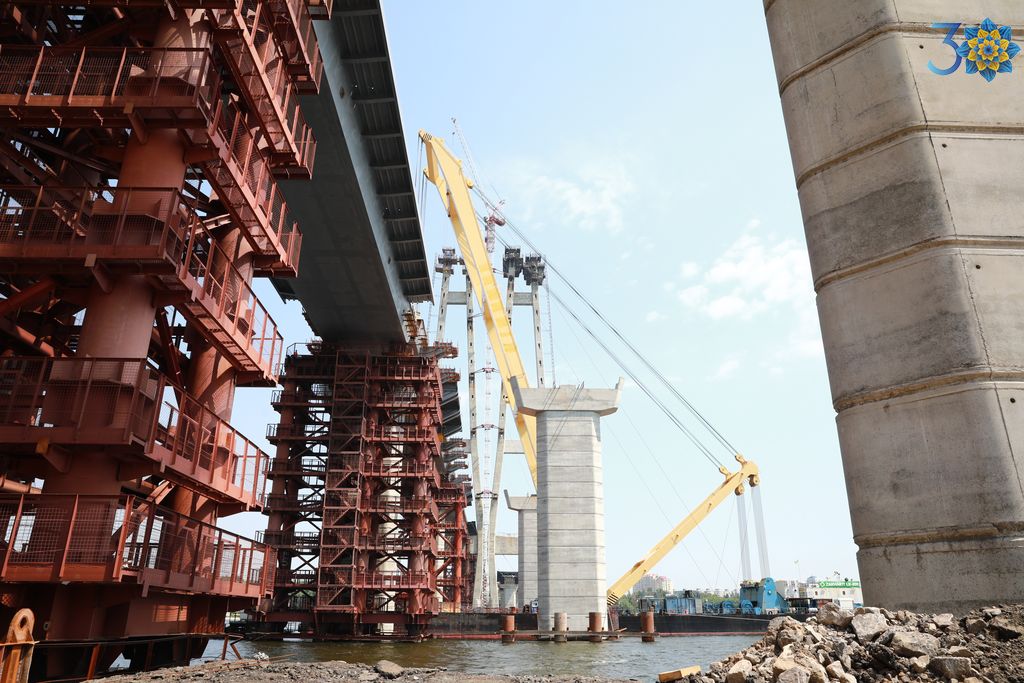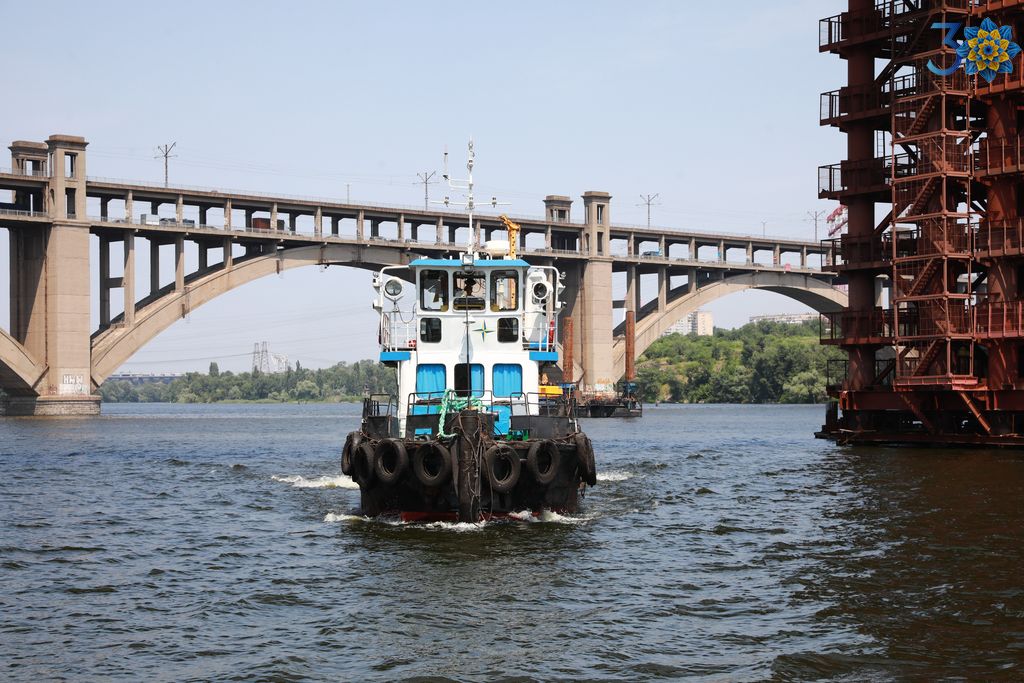 Сьогодні в Запоріжжі мостобудівники встановили останню секцію прогонової будови верхової сторони споруди № 10. Плавучий кран «Захарій» з’єднав Хортицю та лівий берег Дніпра. Тепер можна опускати секції вантового мосту.