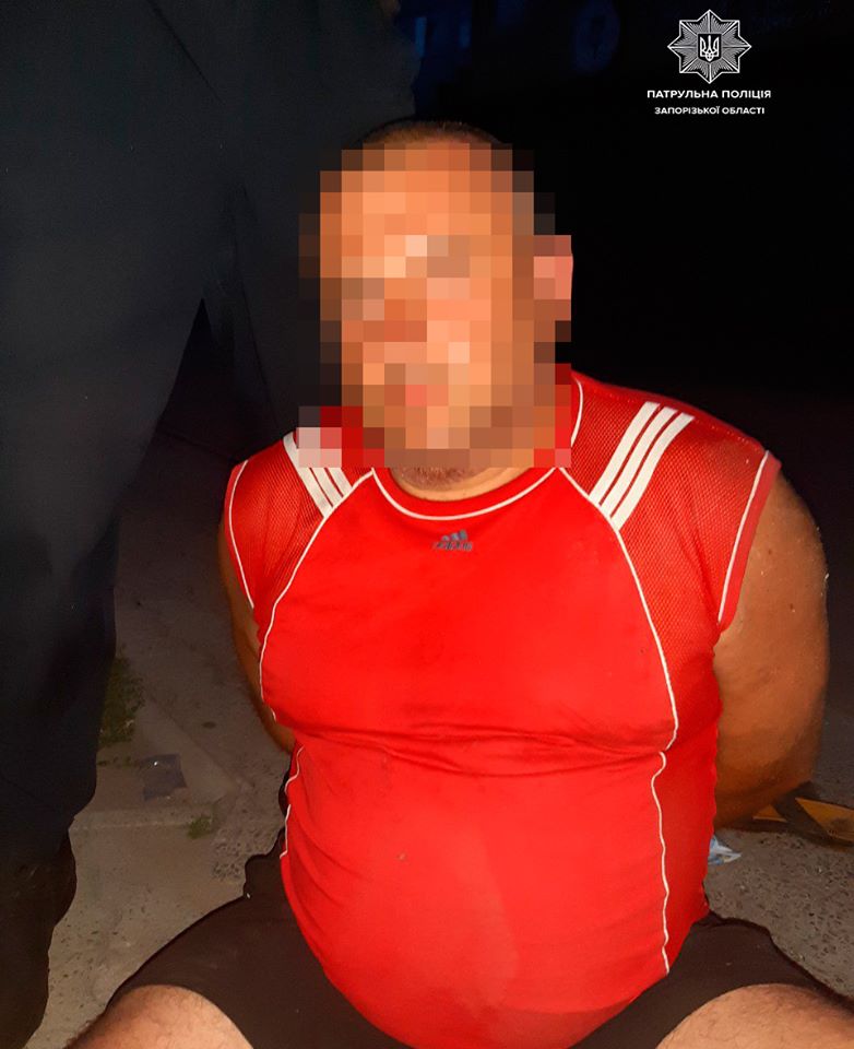Підозрілого 43-річного громадянина затримали о 4:00, на нього одягли кайданки. Трохи пізніше в натовпі поблизу одного з магазинів, який працював цілодобово, помітили чоловіка на тілі якого були плями схожі на кров. На місце події негайно викликали «швидку», повідомляє пресслужба патрульної поліції Запоріжжя.