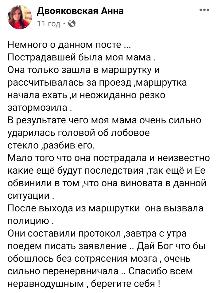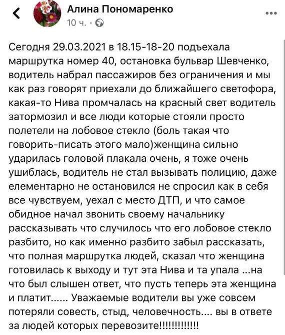 Попри сльози постраждалої, водій поїхав далі. Він телефонував керівництву і розповів про ситуацію. Керівництво відповіло, що винна сама жінка.