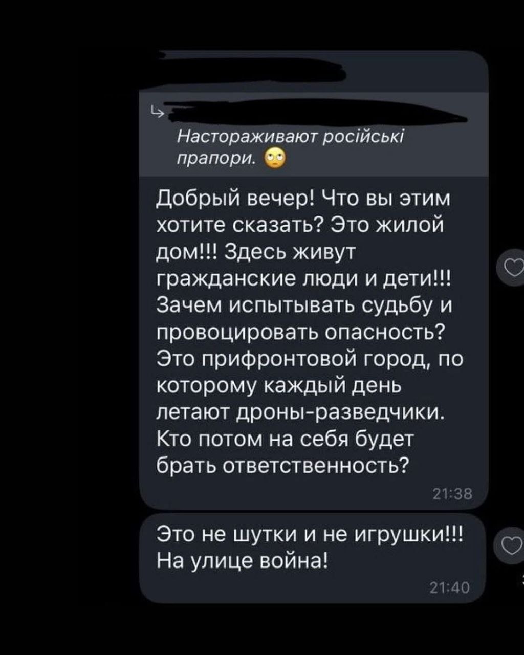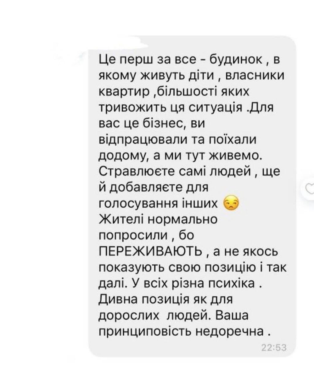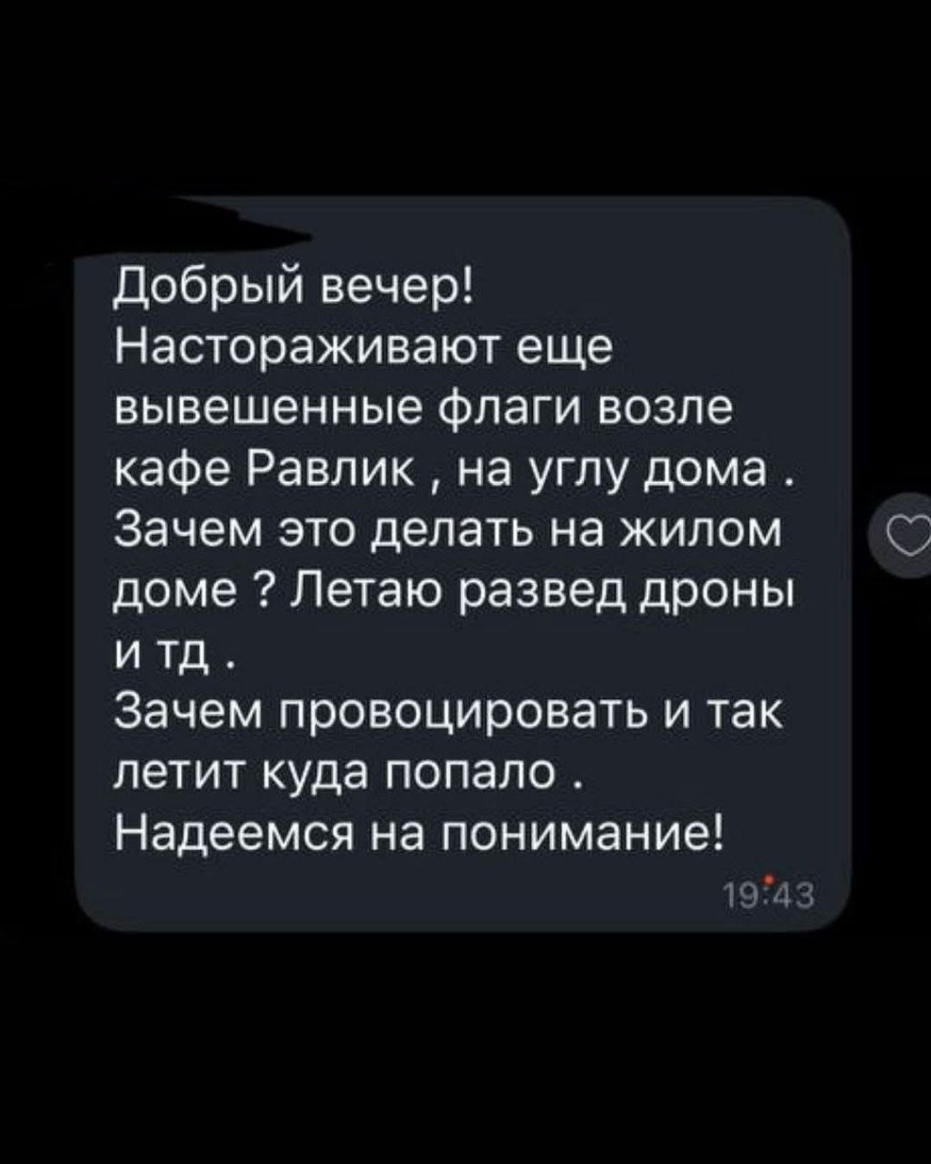 Повідомлення в чаті оприлюднили власники закладу: «Боїмося свого у своїй країні? Навіщо це робити на житловому будинку? Літають розвідувальні дрони. Навіщо провокувати, коли й так летить куди попало?», – пише один із сусідів.