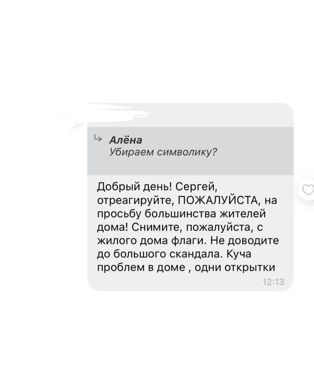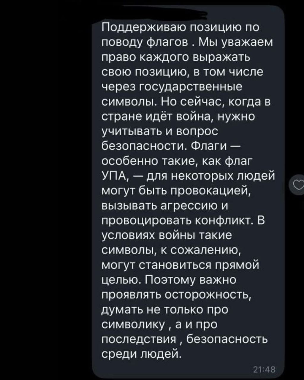 «Ну що, шановні! Довоювалися! У Запоріжжі! У прифронтовому місті, в тилу у наших пацанів, які усіма силами тримають орду, мешканці будинку, в якому розташований наш заклад, вимагають зняти державну символіку, щоб не провокувати ворога!!!