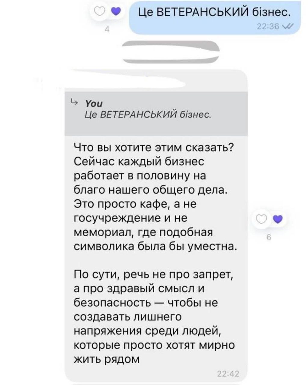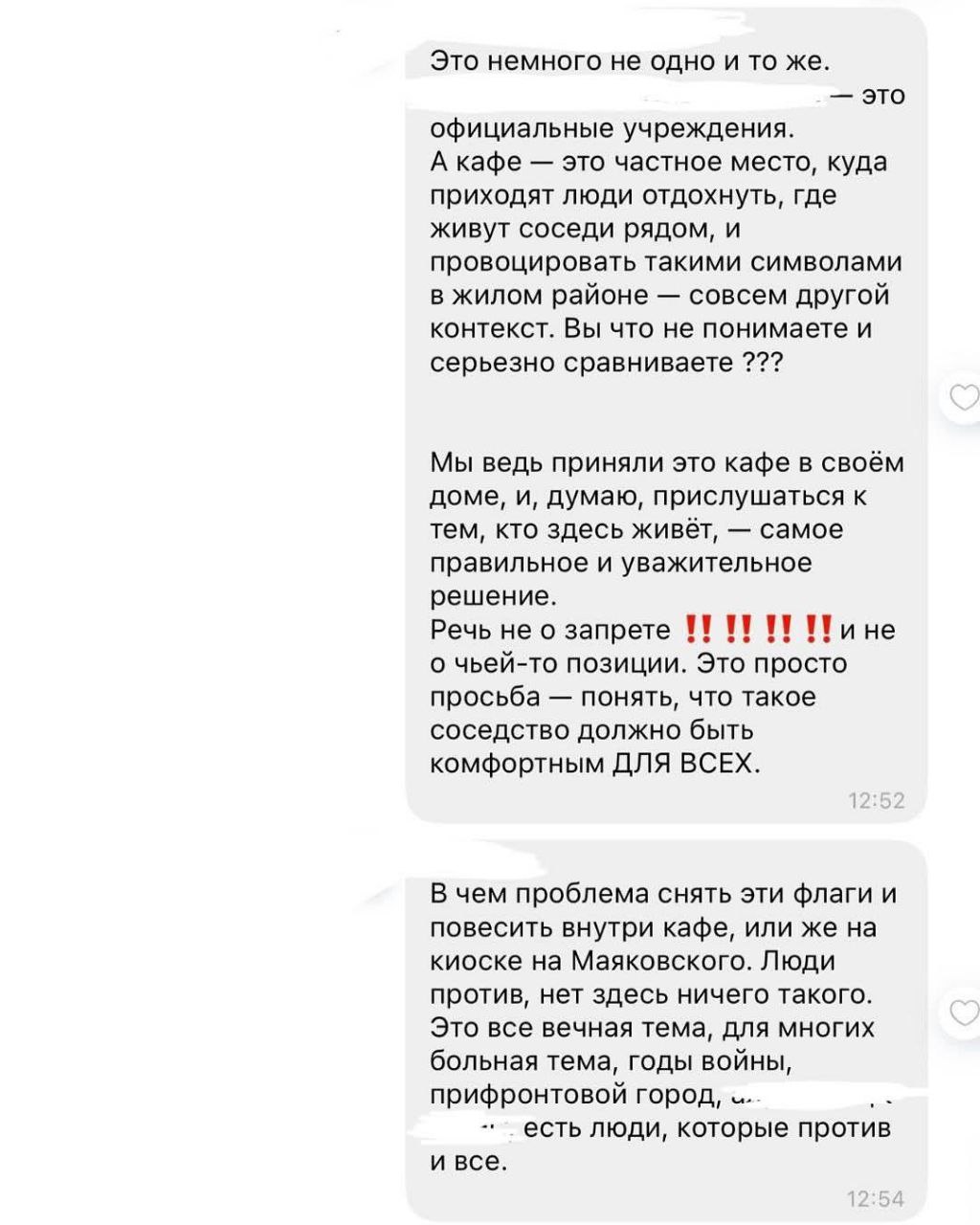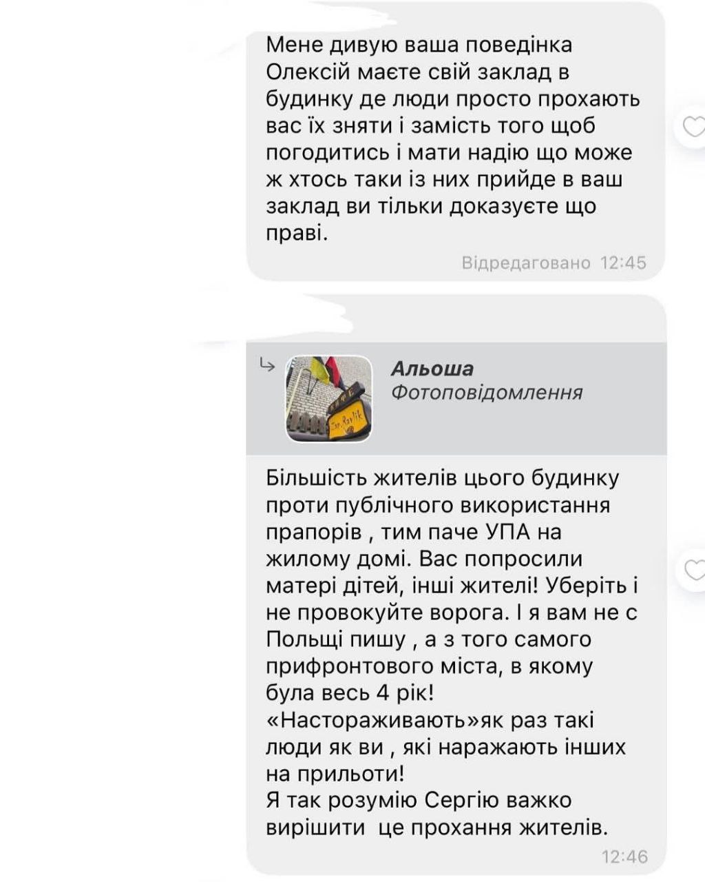 В коментарі журналістам Forpost власник закладу Олексій каже, що після розголосу питання зняття прапора в будинковому чаті вже не стоїть: