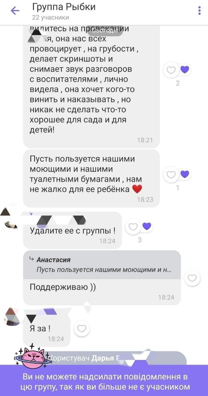 Одна з мам відмовилась здавати таку суму і стала об’єктом натиску зі сторони інших батьків. Мами дітей дізнавшись, що жінка не буде приносити нічого зі списку господарчих товарів (яких до речі в переліку 14 пунктів) та не здаватиме грошей на ремонт — заборонили виховательці давати дитині туалетний папір. Мати жінки зняла запис розмови з вихователькою на камеру, після цього в чаті батьки написали, що дозволяють користуватись «їхнім» папером.