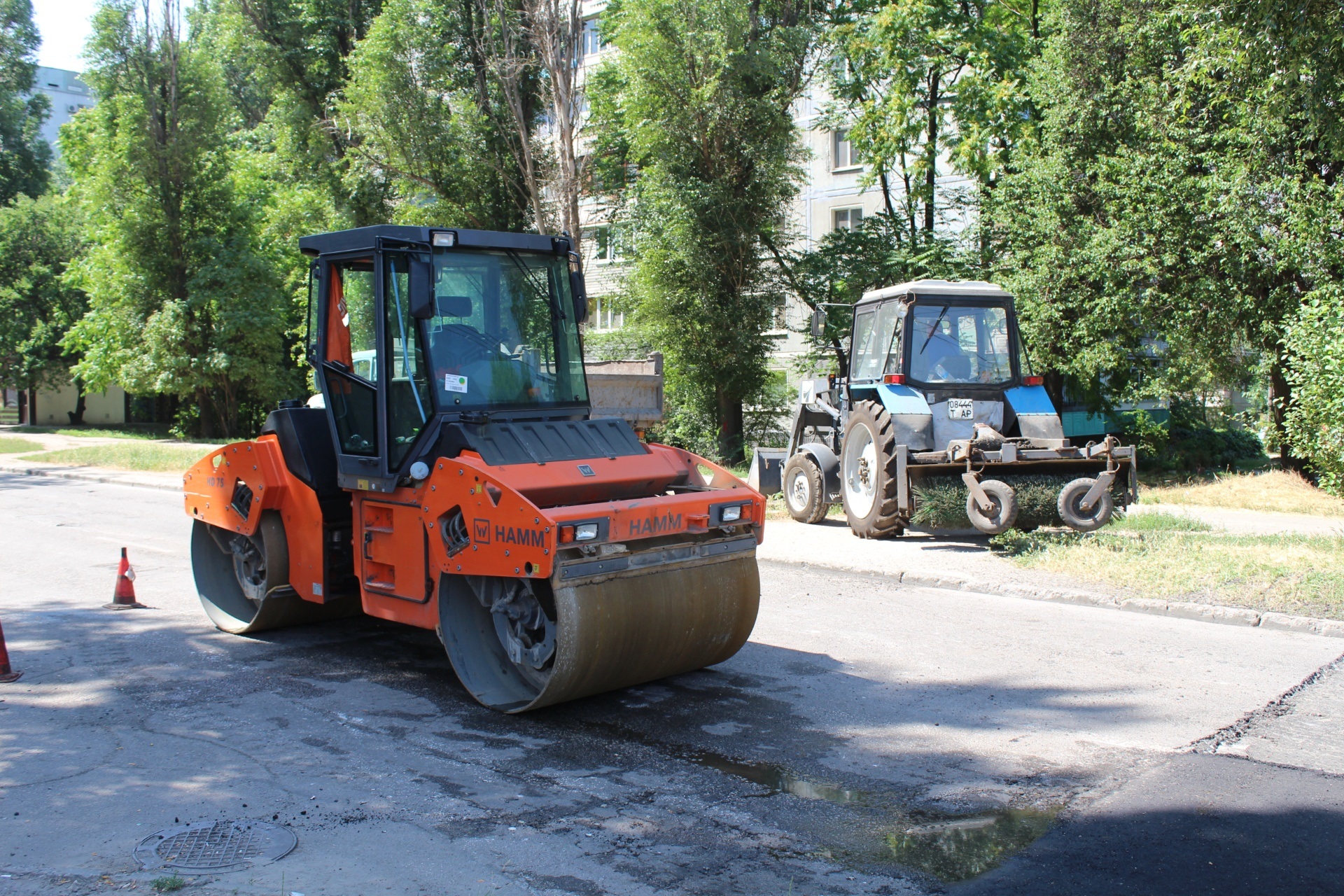 Середній ремонт мають зробити на площі 1000 кв. м. В знаки дається спека. Температура асфальту при вивантаженні досягає 160 градусів. Щоб нове покриття швидше охололо його поливатимуть водою.