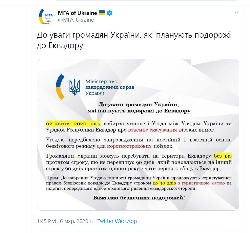 «До набрання угодою чинності громадяни України продовжують користуватися правом безвізових поїздок до Еквадору строком до 90 днів з туристичною метою на підставі попереднього одностороннього рішення еквадорської сторони», — йдеться в повідомленні.