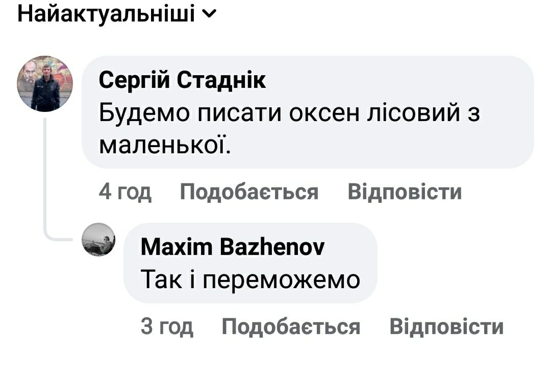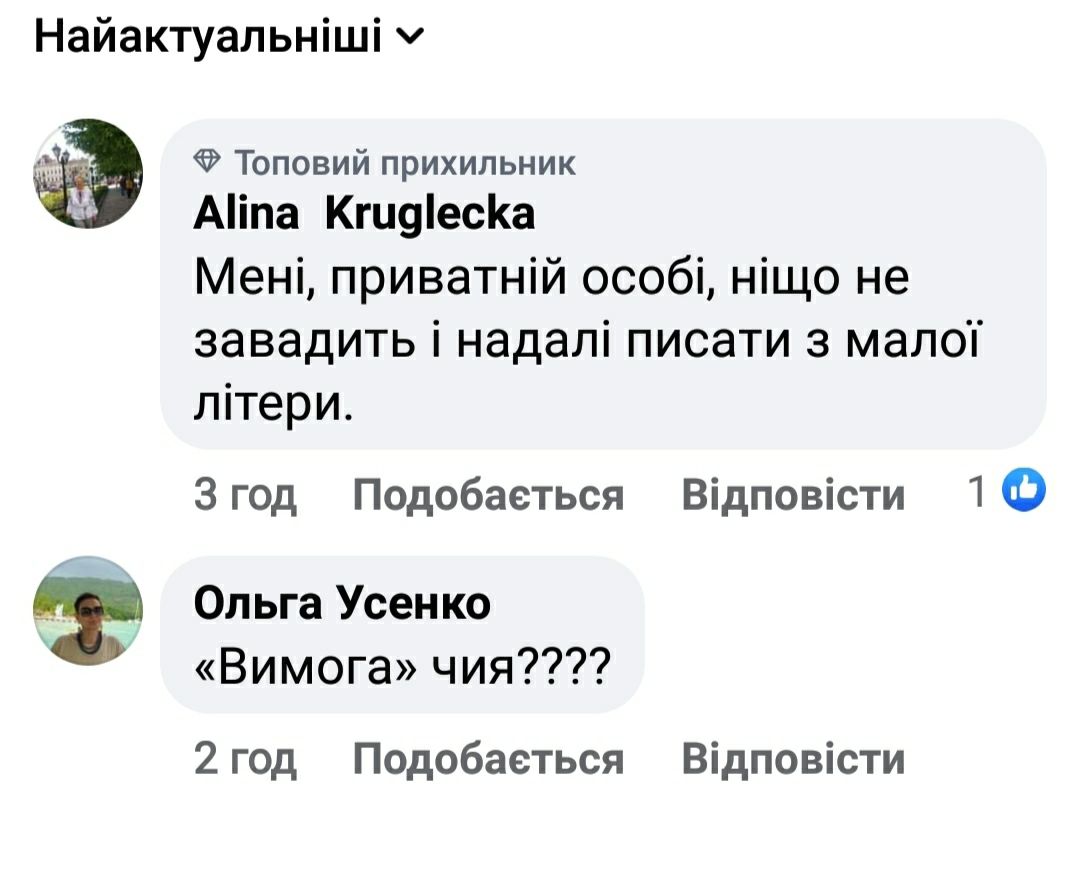 Пізніше у соціальних мережах інші громадяни висловили свою позицію, вважаючи не доречним розпорядження Оксена Лісового щодо виправлення попереднього наказу, в якому було вказано, що відтепер слова, пов’язані з країною-агресором, треба писати саме з великої букви.