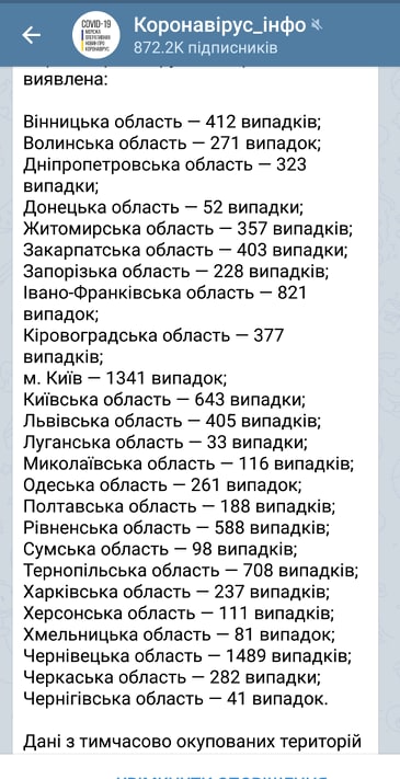 Лабораторно підтверджено 9866 хворих на коронавірус. З них 250 летальних випадків, 1103 пацієнти одужали. За добу зафіксовано 456 нових випадків.
