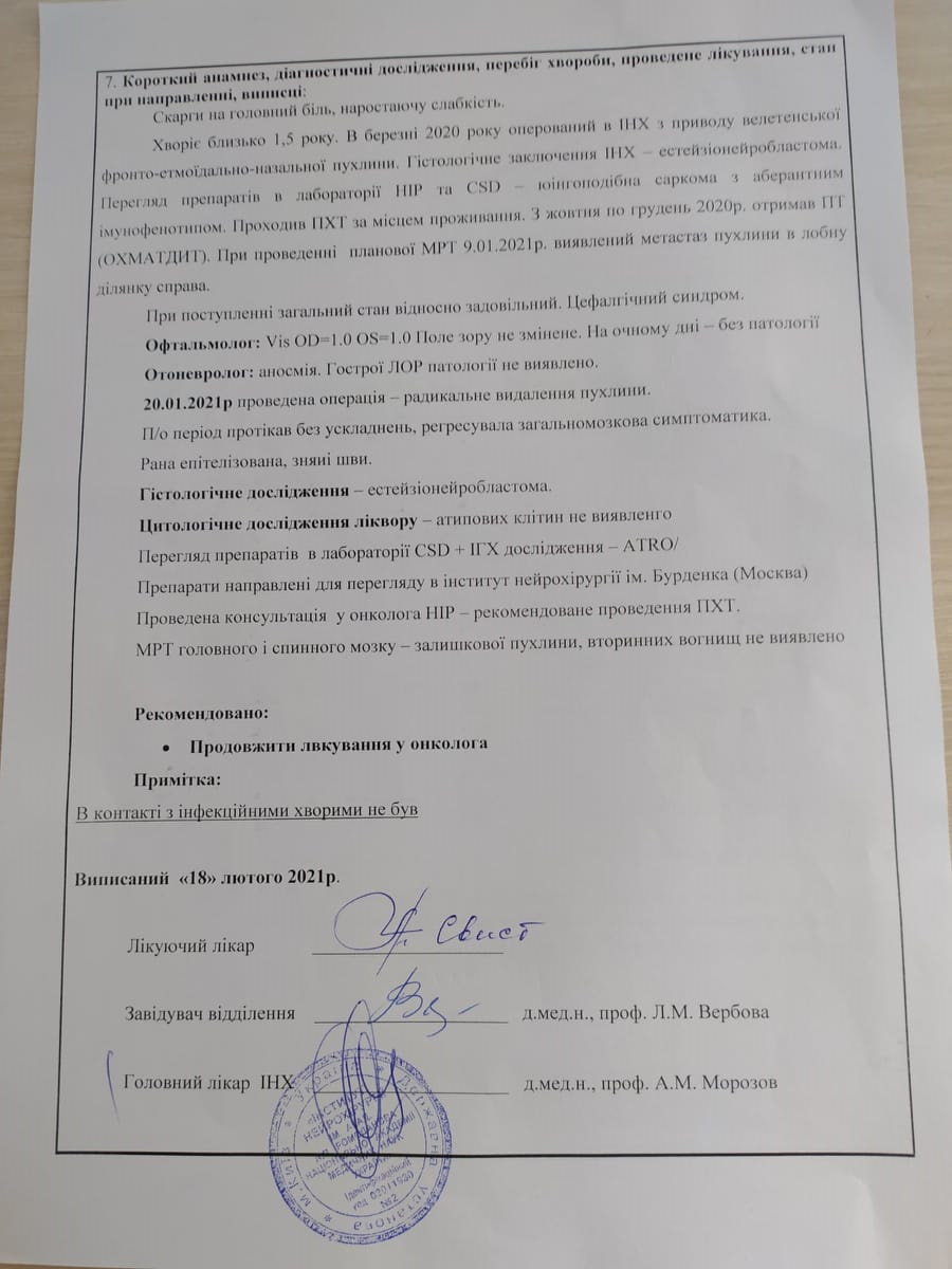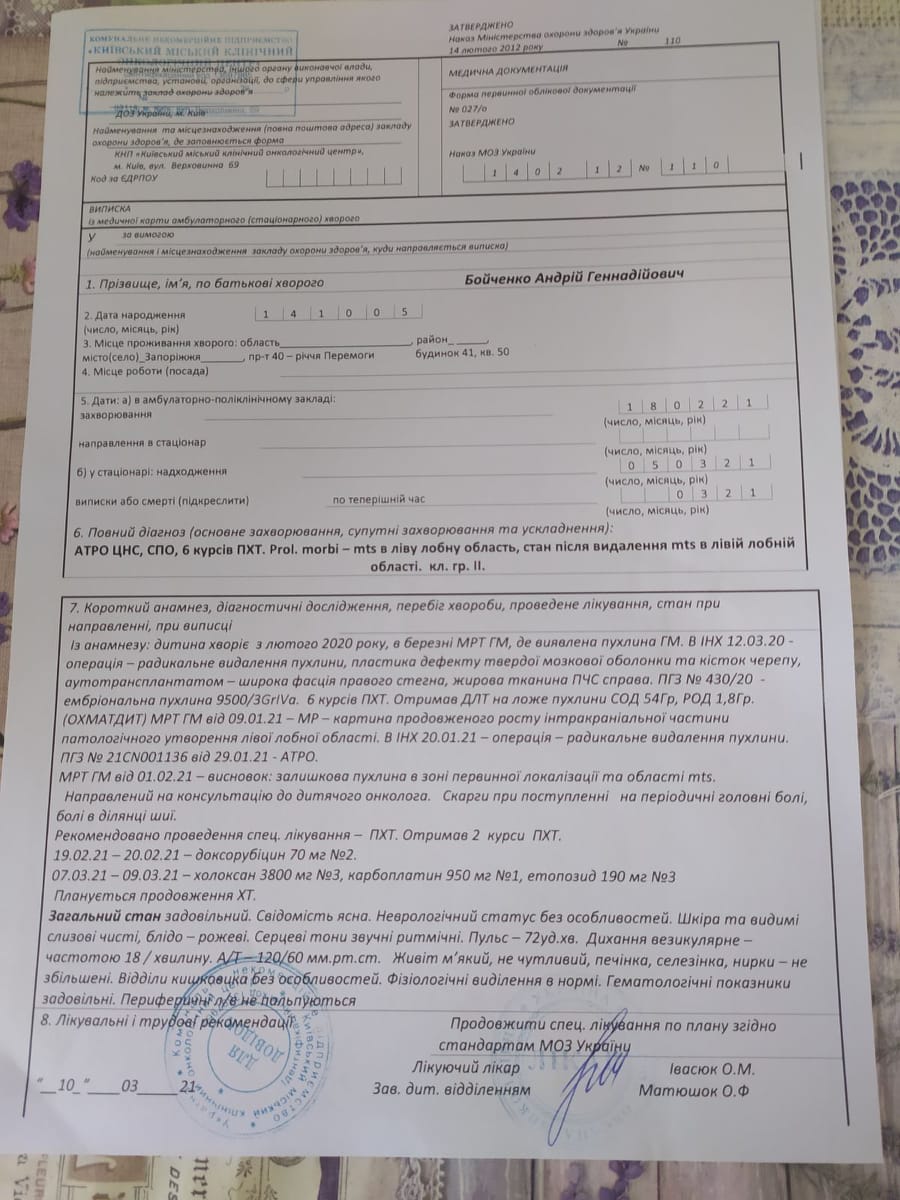 Наразі потрібні кошти на препарат для шостого та дев’ятого блоку хіміотерапії — Космеген, якого немає в лікарні. Коштує препарат 40 тисяч гривень. Окрім цього потрібно постійно проходити КТ та МРТ. Ціна одного МРТ — 9700 гривень, його роблять після кожного блоку хіміотерапії.