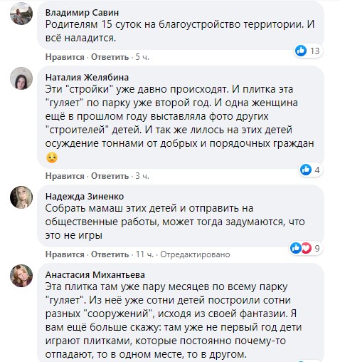 Інша ж частина вважає, що така поведінка не є нормальною та їхні батьки повинні взяти на себе відповідальність. Як пишуть місцеві мешканці, виявляється, що плиткою вже другий рік граються діти в парку і звинувачують працівників, які неякісно закріпили бруківку.