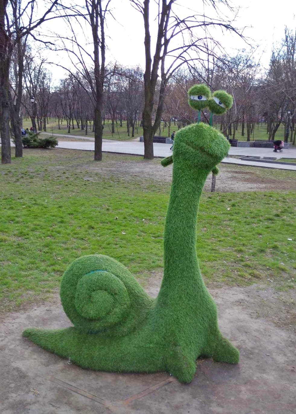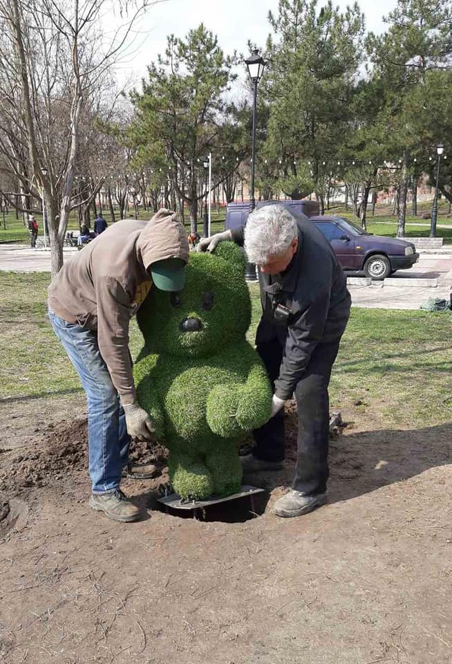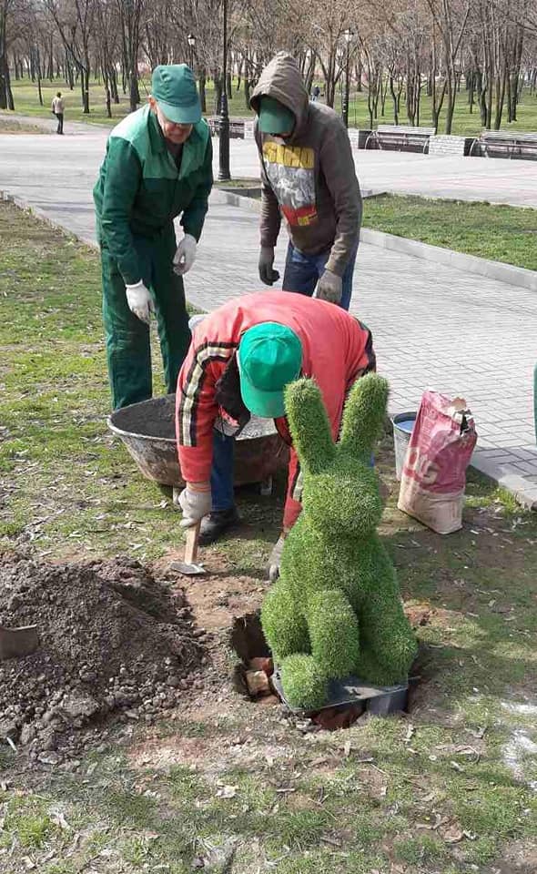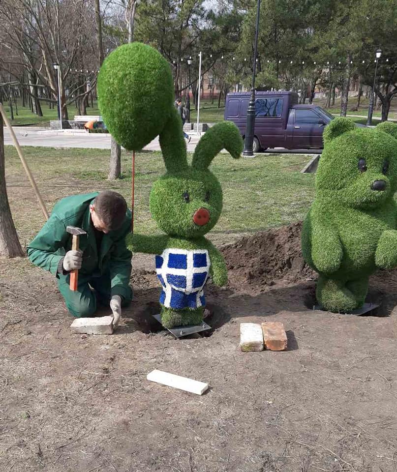 Працівники КП Зеленбуд Запорізької міської ради встановило зелені скульптури в одному з запорізьких парків. Сподіваються, що мультяшні герої простоять весь сезон і не будуть зруйновані вандалами.
