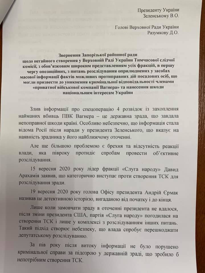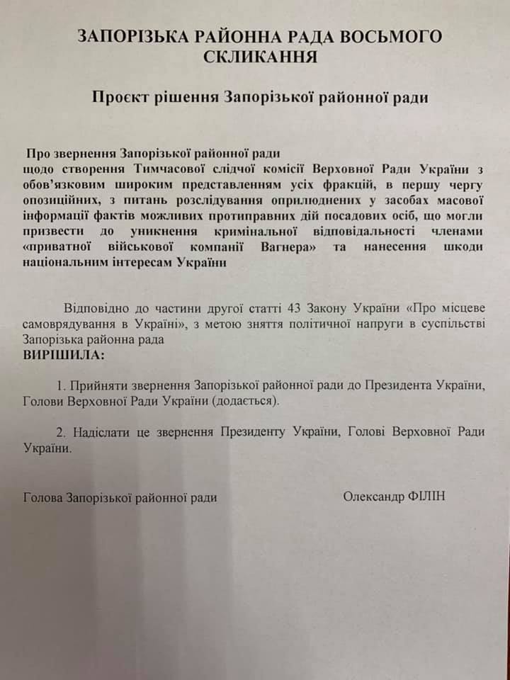 Фракція «Європейська Солідарінсть» подала заяву про скликання позачергової сесії районної ради. Депутати ЄС закликають колег прийняти звернення про негайне створення у Верховній Раді ТСК з метою розслідування фактів протиправних дій посадових осіб, що могли уникнути кримінальної відповідальності членами «приватної військової компанії Вагнера» на нанесення шкоди національним інтересам України.