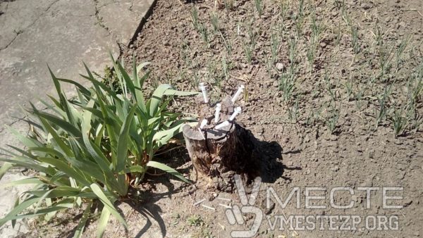 Местные жители запечатлели очередной факт, подтверждающий, что здесь творится неизвестно что. Определенные личности, явно страдающие наркотической зависимостью превратили обычный пенёк в «ёжика», утыканного использованными шприцами. Рядом валялись и колпачки от игл.