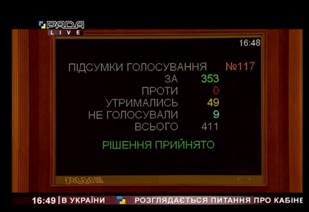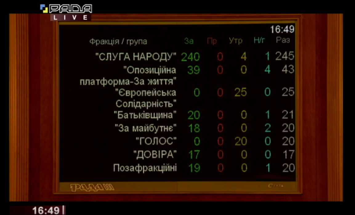 За відставку Гончарука проголосувало 353 депутати. Проти не проголосував ніхто. Утрималися 49 депутатів. 9 депутатів не голосувало.