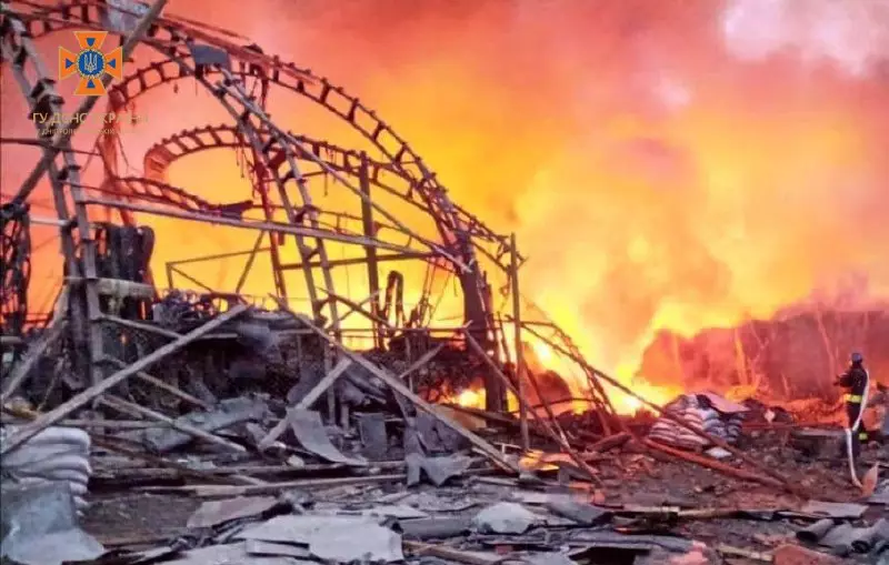Один з боєприпасів влучив в ангар з будівельними матеріалами. Внаслідок чого виникла пожежа на площі 400 м. кв. Співробітники Служби порятунку врятували з-під завалів жінку, 1970 року народження.