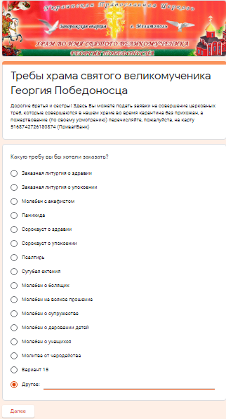 На сайті храму «Георгія Побідоносця» священнослужителі пропонують подавати заявки онлайн на здійснення церковних треб. В принципі, в цьому немає нічого дивного багато церков після введення карантину почали активну діяльність в соціальних мережах, на сайтах. Трохи «осучаснилися».