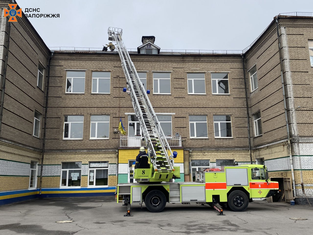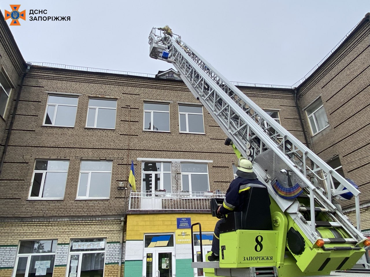 На місце події вирушили рятувальники. З використанням 30-метрової автодрабини IVECO Magirus вони досягли покрівлі гімназії та ліквідували небезпеку, демонтуючи конструкцію.