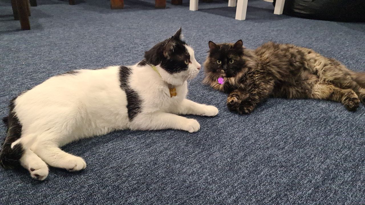 Зараз тут 5 котів. Їх привезли волонтери. Є й ті кого доставили сюди з лінії фронту: це братик та сестричка Фаня та Димок. Не дивлячись на те, що вони мають травму очей (у дівчинки Фані лише 20 відсотків зору), вони дуже активні та грайливі. Після лікування їх ще чекає процес реабілітації. Все на себе візьмуть зоозахисники разом з власниками котокафе.