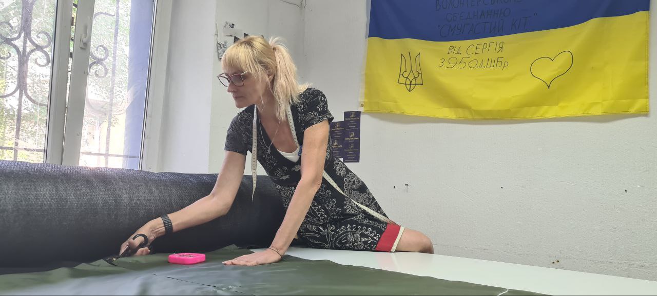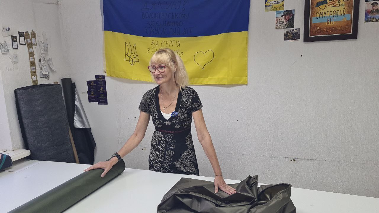 «Я лише за день ось тут біля столу набігаю десь 7 кілометрів», — ділиться закрійниця швейного цеху волонтерського об’єднання «Смугастий кіт» Оксана Шабанова.