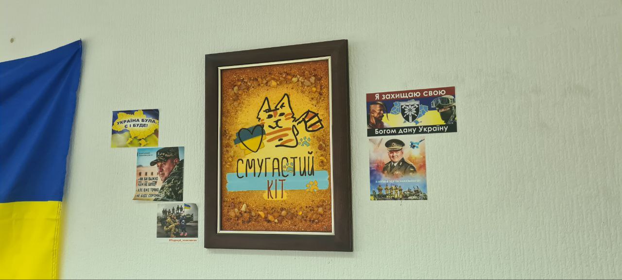 У цеху розвішений прапор з написом головнокомандувача ЗСУ Валерія Залужного. А поруч на поличці стоїть гільза перемоги що працювала у звільненому Херсоні. А невеличкі трофеї від військових волонтери розігрують під час благодійних аукціонів.