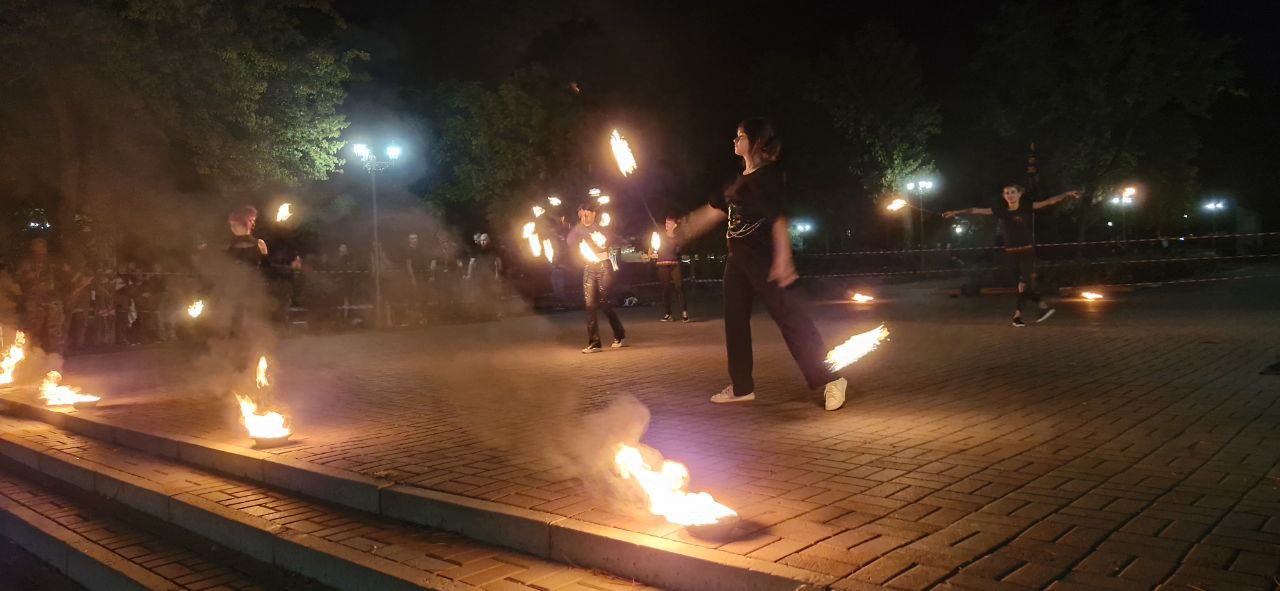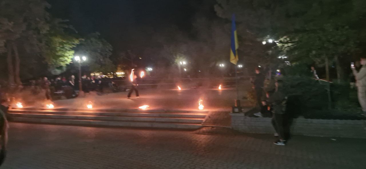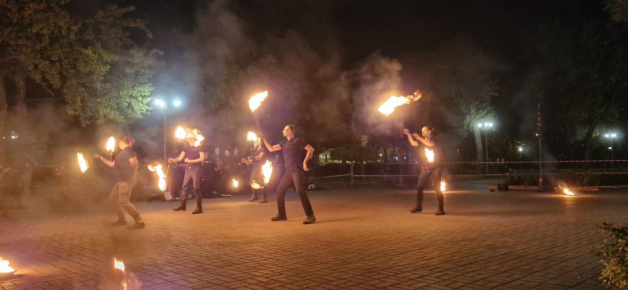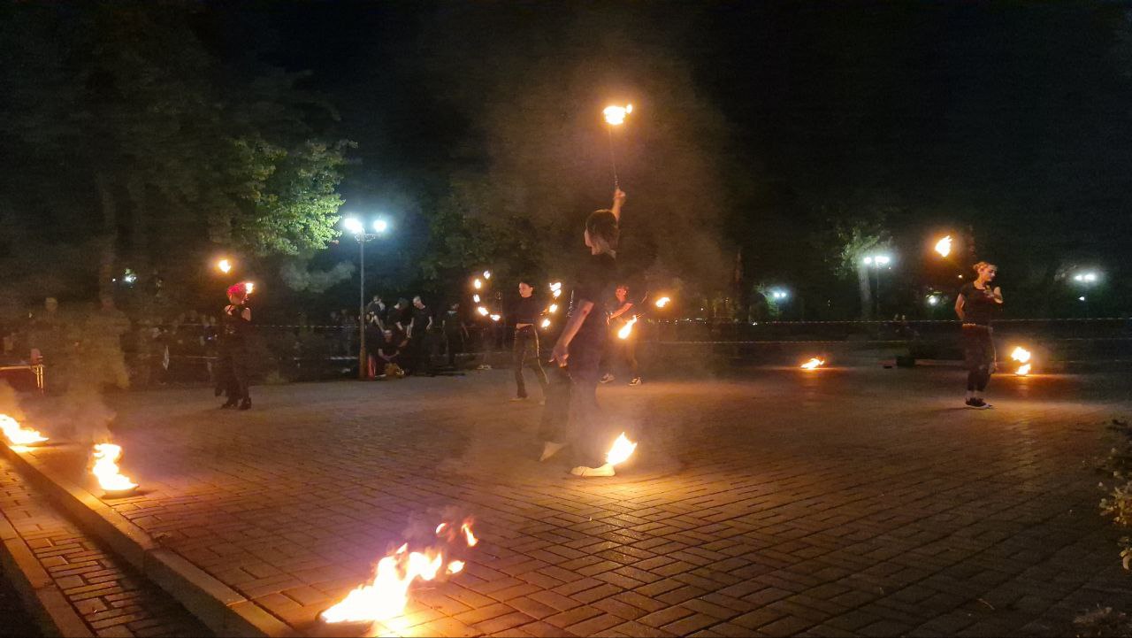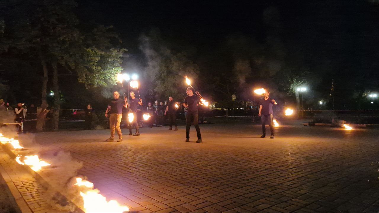 У Запоріжжі на площі Маяковського відбувся виступ артистів вогняного жанру, під час якого тривав збір коштів для військових совенят 110 окремої механізованої бригади.